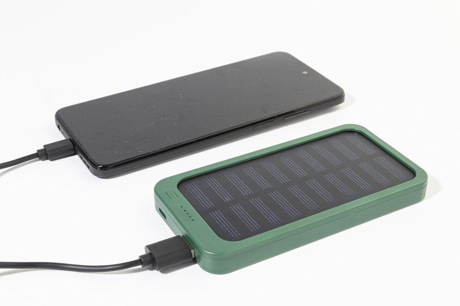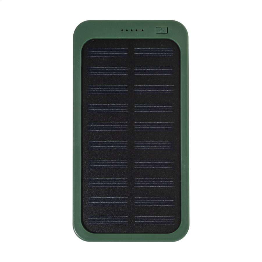 Power banka z recyklovaného ABS plastu s vestavěnou solární nabíječkou a baterií 4000 mAh. S 1 USB a 1 USB-C portem pro nabíjení. Vstupní port USB-C. Včetně nabíjecího kabelu USB.