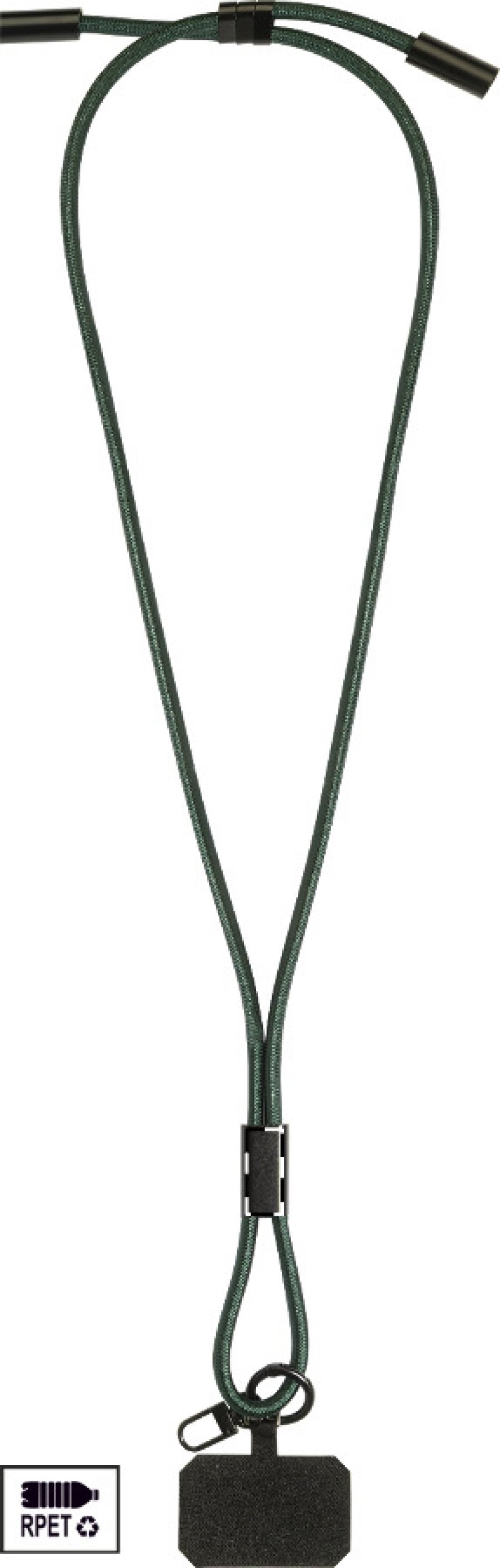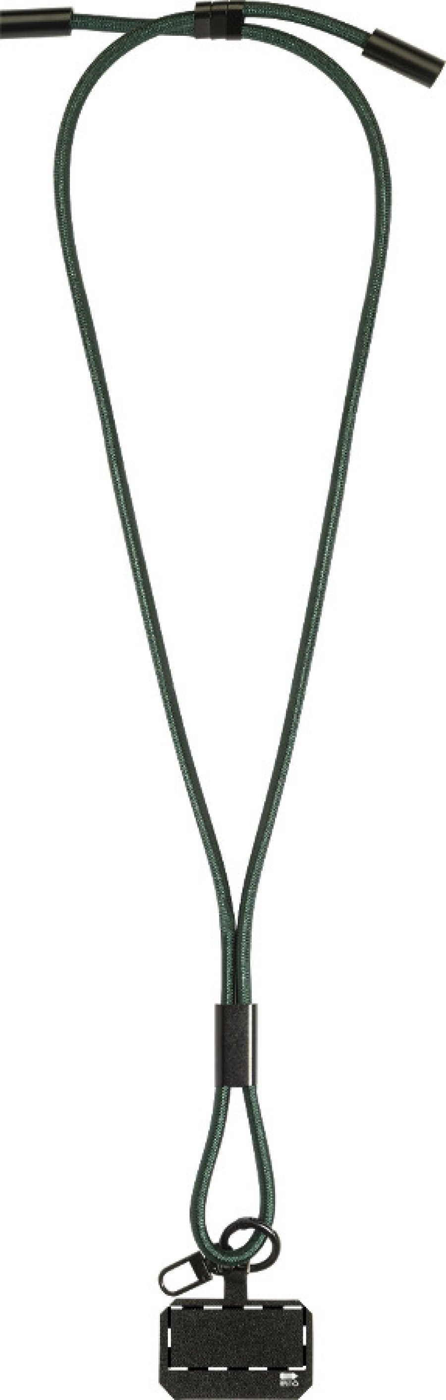 Šňůrka s držákem na mobil z RPET s vložkou pro telefon, karabinou a integrovaným nabíjecím kabelem USB-C na USB-C se skrytými konektory. Podporuje rychlé nabíjení a přenos dat PD 60W.