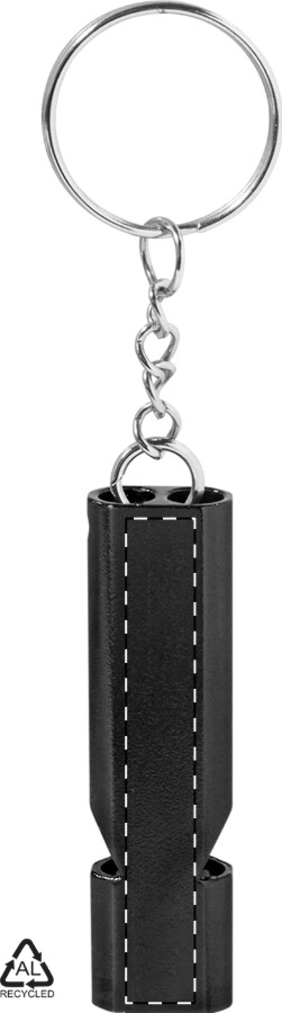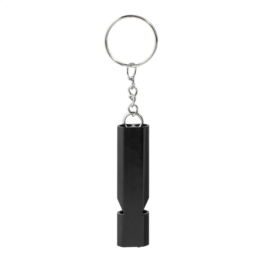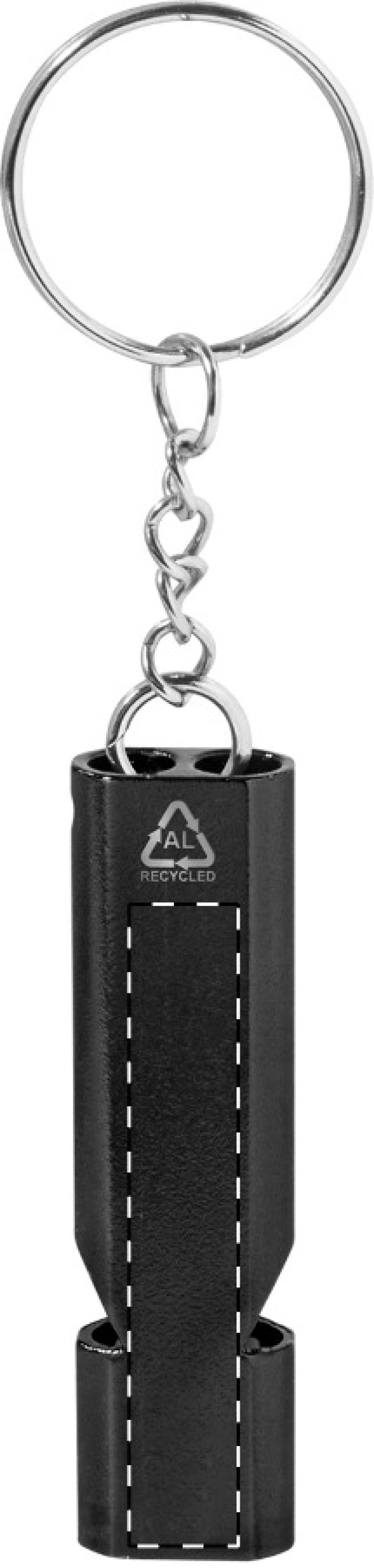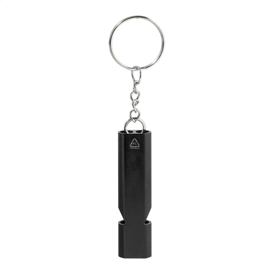 Píšťalka z recyklovaného hliníku s kovovým kroužkem na klíče.