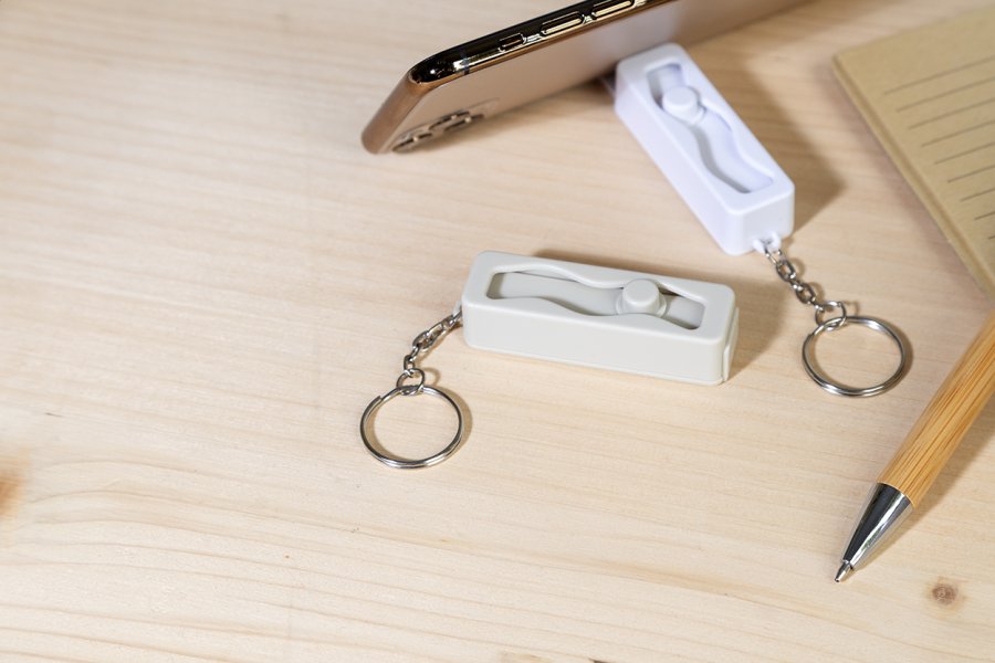 Antistresový přívěšek na klíče fidget z recyklovaného ABS materiálu s integrovaným držákem na mobil a kovovým kroužkem.