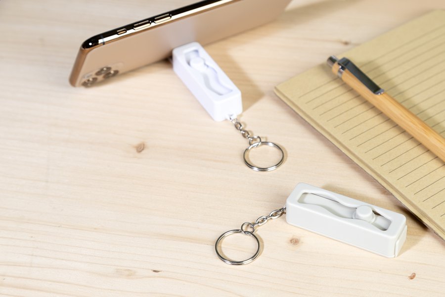 Antistresový přívěšek na klíče fidget z recyklovaného ABS materiálu s integrovaným držákem na mobil a kovovým kroužkem.