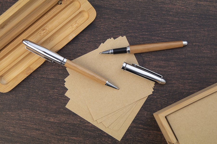Elegantní sada s kuličkovým perem a rollerem, bambus/kov v dárkové krabičce z bambusu. S modrou náplní.