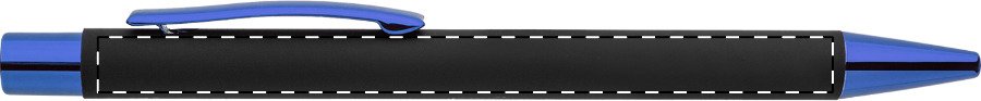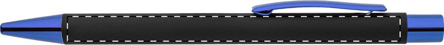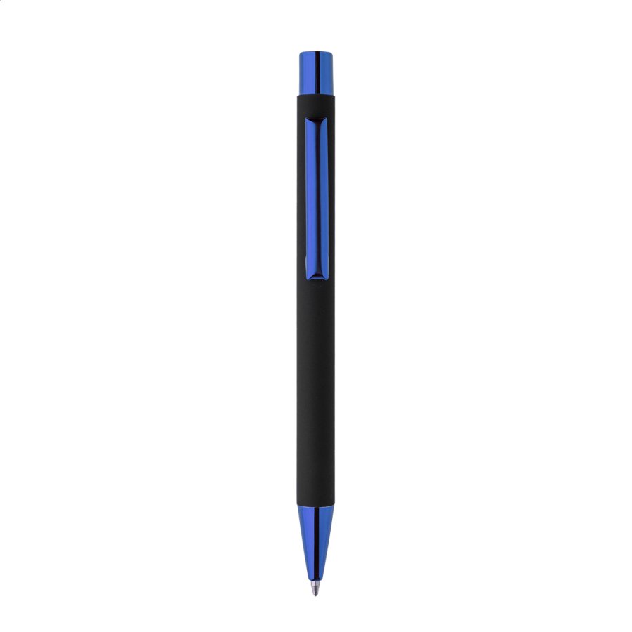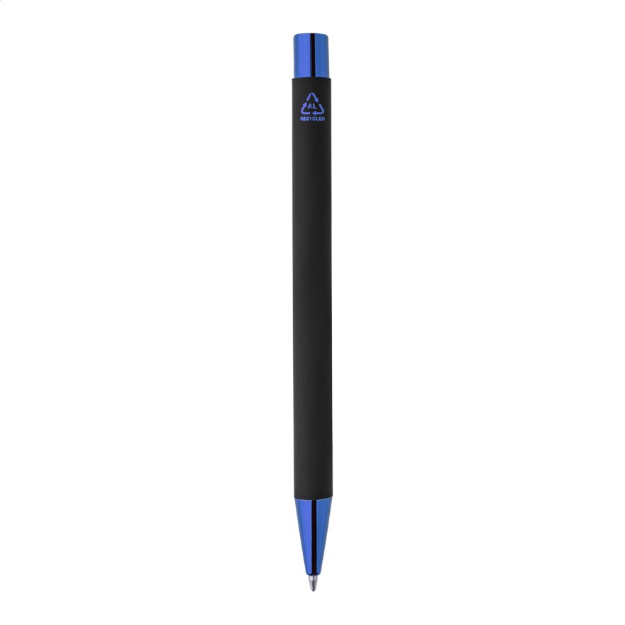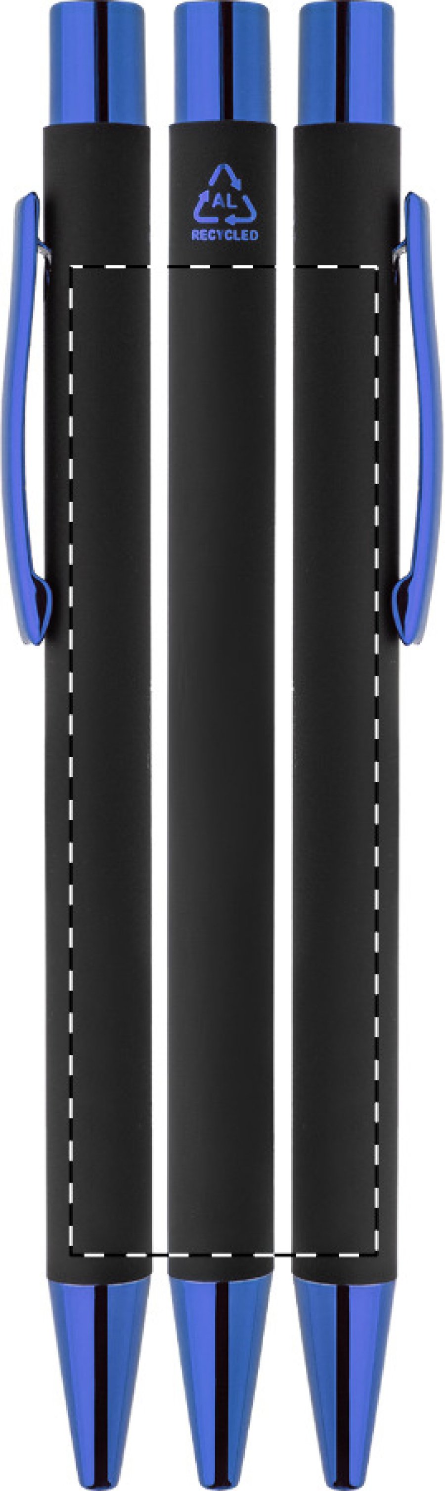 Kuličkové pero z recyklovaného hliníku s černým pogumovaným tělem a barevnými lesklými kovovými částmi. Se speciálním povrchem pro zrcadlové gravírování, které ladí s kovovými částmi. S modrou náplní.