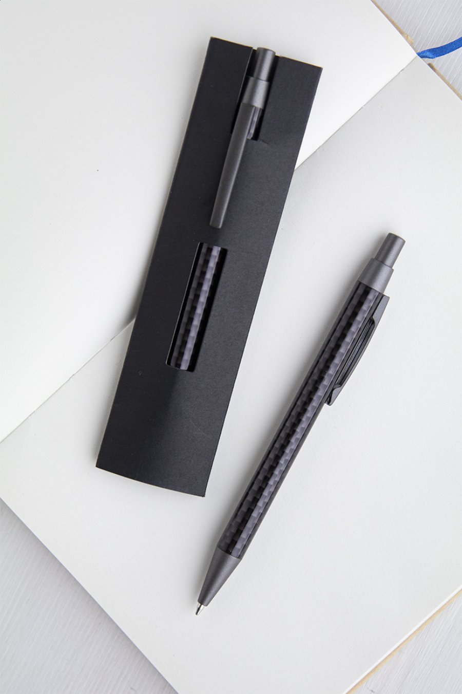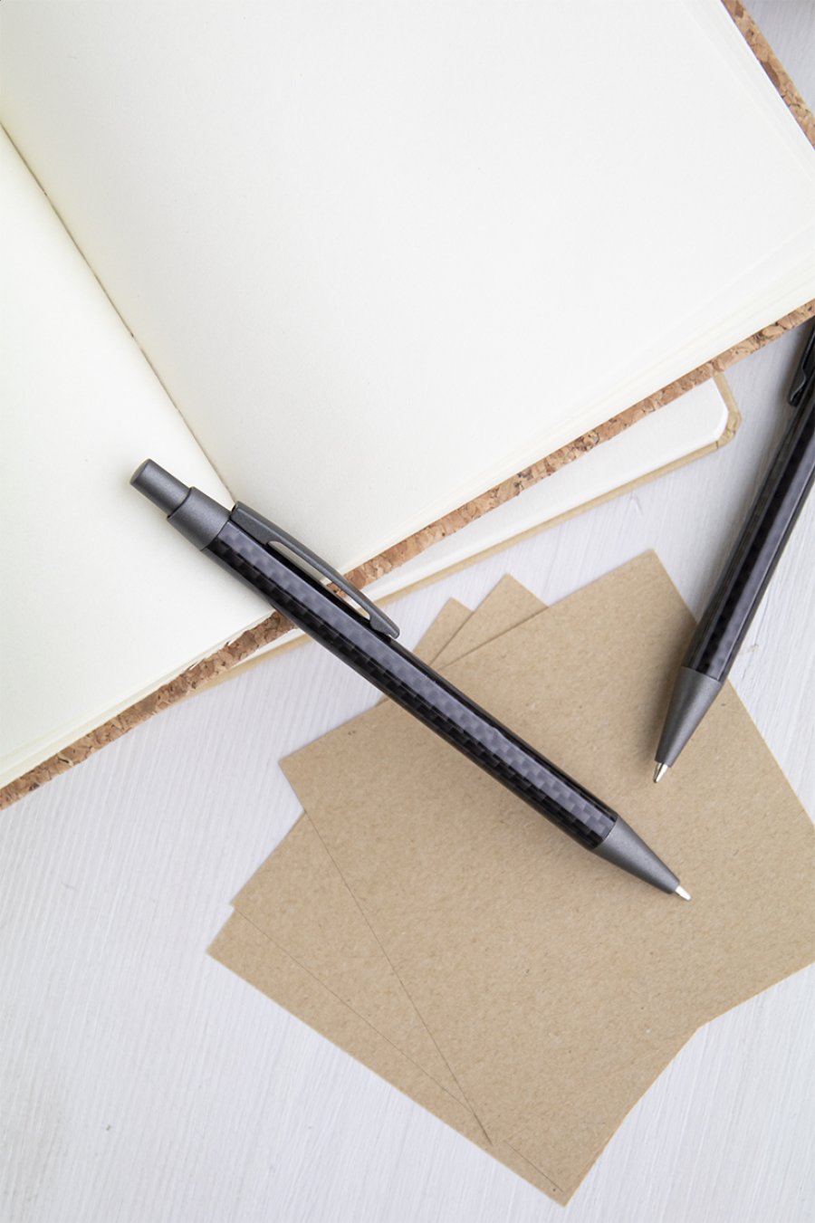 Kovové kuličkové pero s karbonovým vzorem na těle, v černém papírovém pouzdře, s modrou náplní.