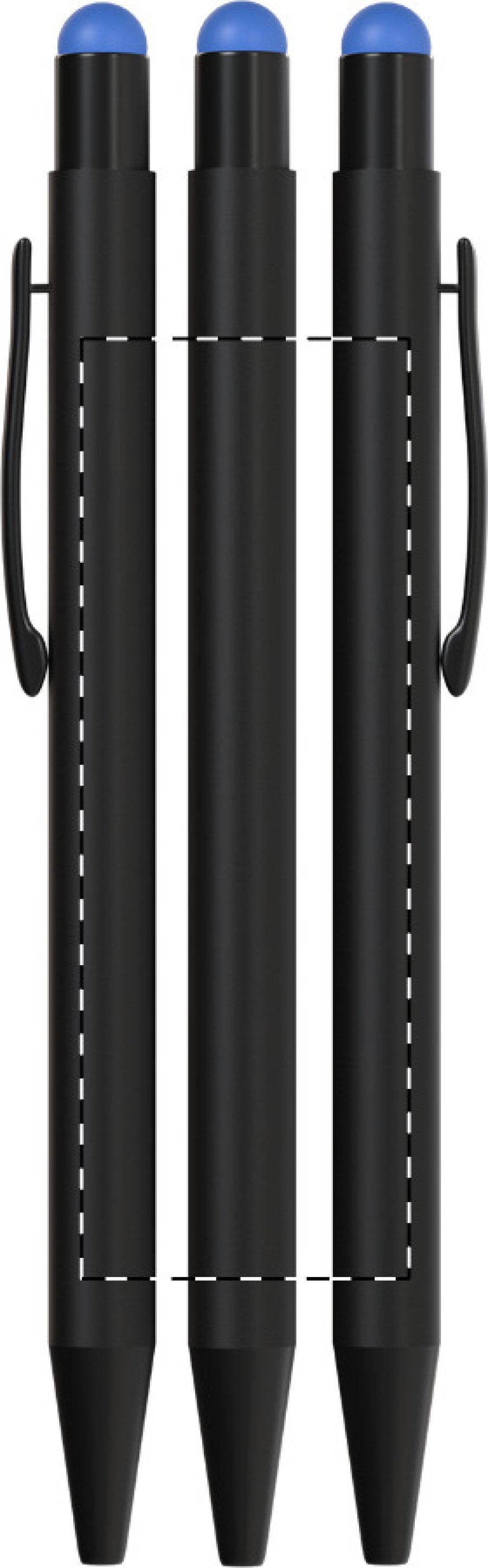 Hliníkové kuličkové a dotykové pero s pogumovanou úpravou a speciálním povrchem pro zrcadlový laser v barvě stylusu, s modrou náplní.