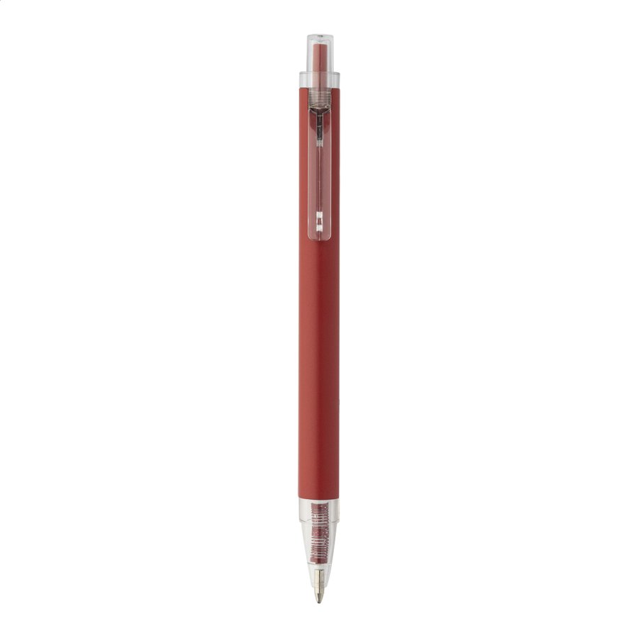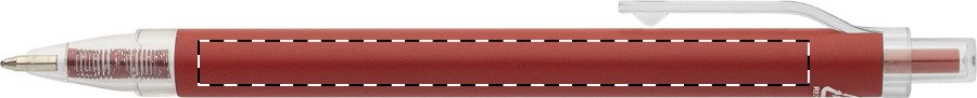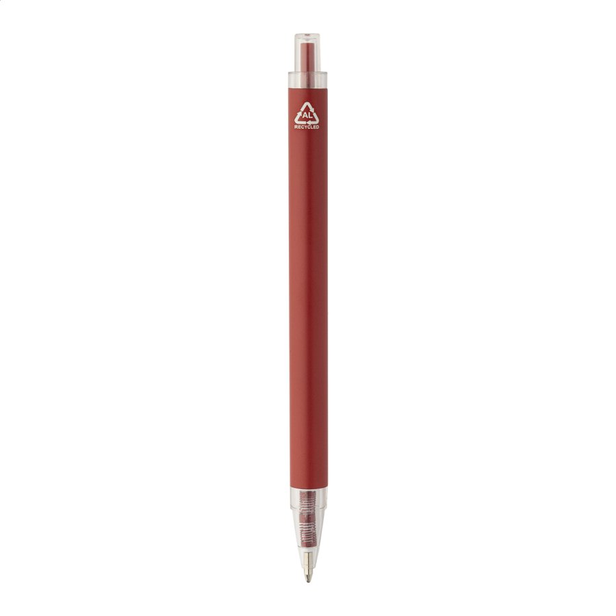 Kuličkové pero z recyklovaného hliníku s matným tělem a průhlednými RPET částmi. S modrou náplní.