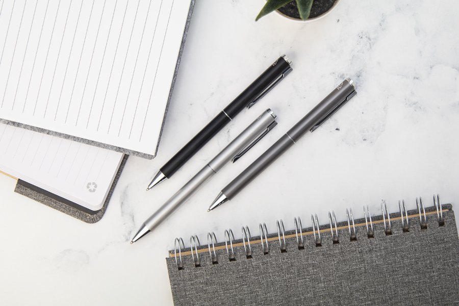 Sada pera z recyklovaného hliníku s rollerem a kuličkovým perem v černé papírové dárkové krabičce. S modrou náplní.