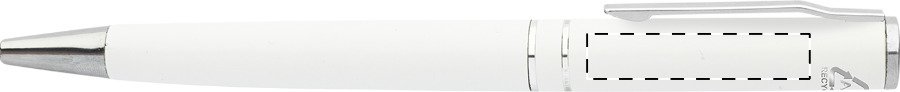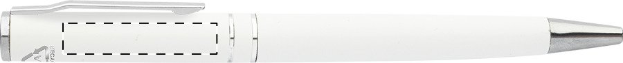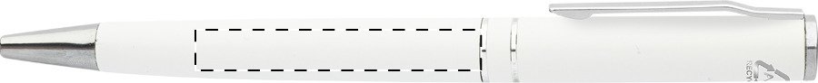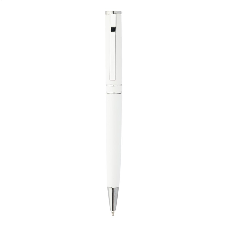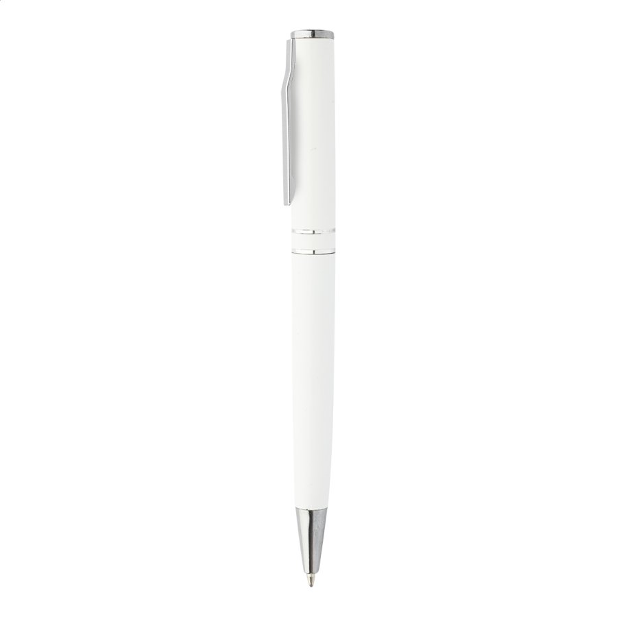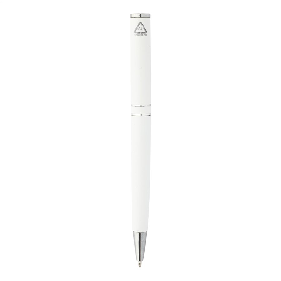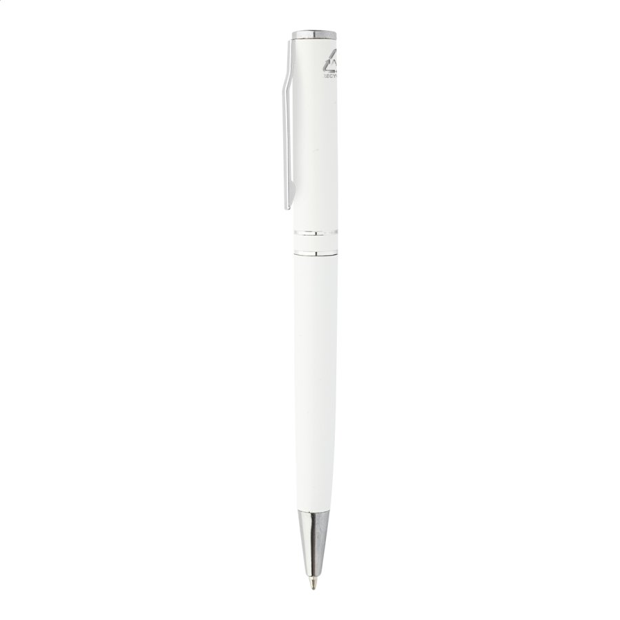 Kuličkové pero z recyklovaného hliníku s chromovanými částmi a kroužky. V černé dárkové krabičce. S modrou náplní.