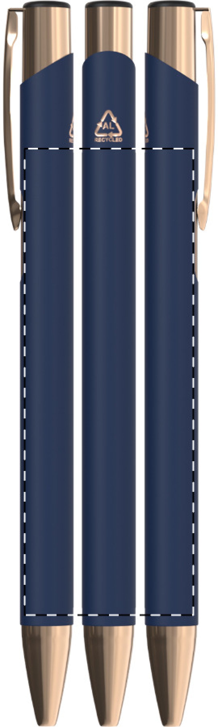 Kuličkové pero z recyklovaného hliníku s pogumovaným povrchem a detaily v barvě růžového zlata. Se speciální povrchovou úpravou pro zrcadlové laserové gravírování v barvě růžového zlata. S modrou náplní.