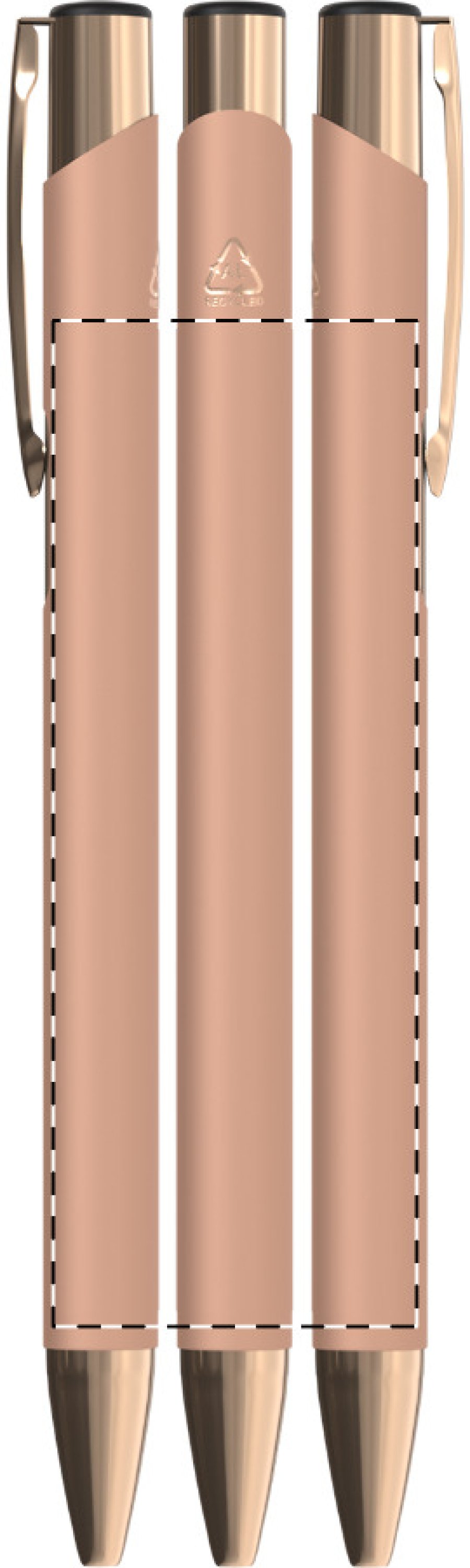 Kuličkové pero z recyklovaného hliníku s pogumovaným povrchem a detaily v barvě růžového zlata. Se speciální povrchovou úpravou pro zrcadlové laserové gravírování v barvě růžového zlata. S modrou náplní.