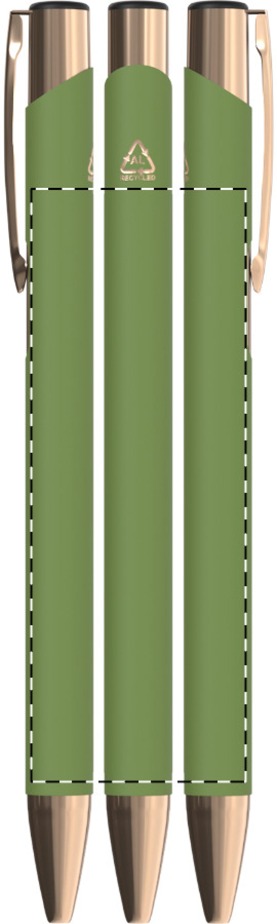 Kuličkové pero z recyklovaného hliníku s pogumovaným povrchem a detaily v barvě růžového zlata. Se speciální povrchovou úpravou pro zrcadlové laserové gravírování v barvě růžového zlata. S modrou náplní.