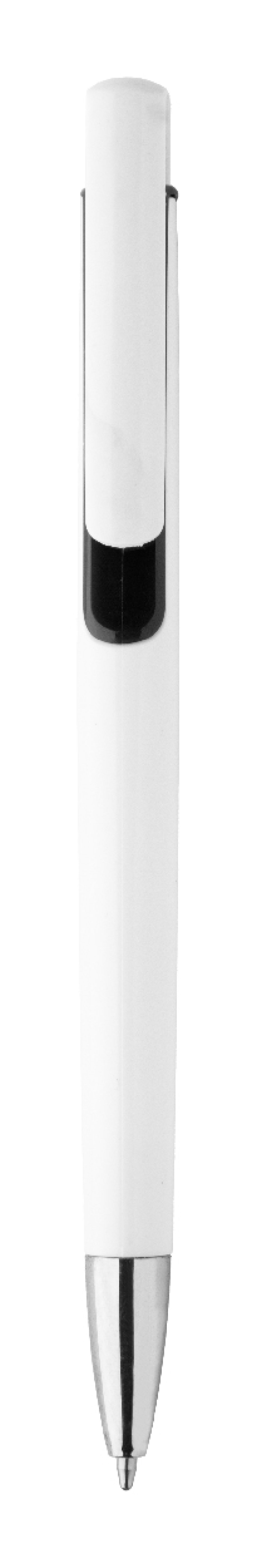 Plastové kuličkové pero s barevnými doplňky a chromovou špičkou. Do dáváno s modrou náplní.