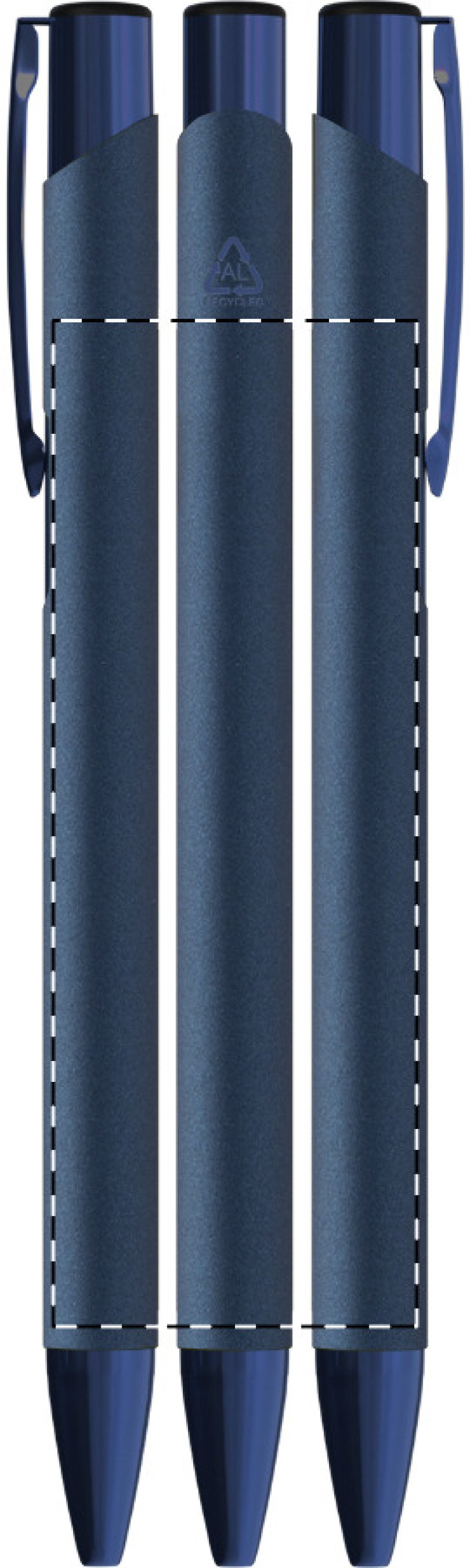 Kuličkové pero z recyklovaného hliníku s pogumovaným tělem a barevnými lesklými kovovými díly. Se speciálním povrchem pro zrcadlové gravírování, které odpovídá kovovým částem. S modrou náplní.