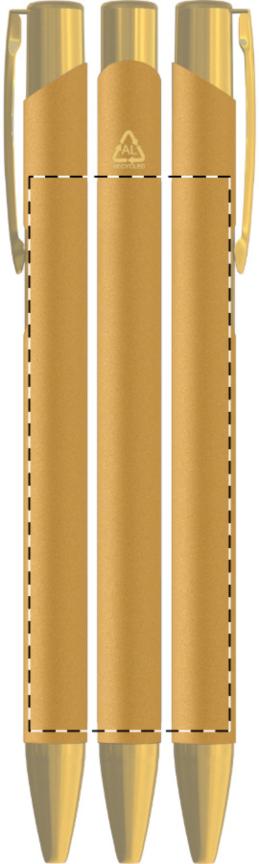 Kuličkové pero z recyklovaného hliníku s pogumovaným tělem a barevnými lesklými kovovými díly. Se speciálním povrchem pro zrcadlové gravírování, které odpovídá kovovým částem. S modrou náplní.