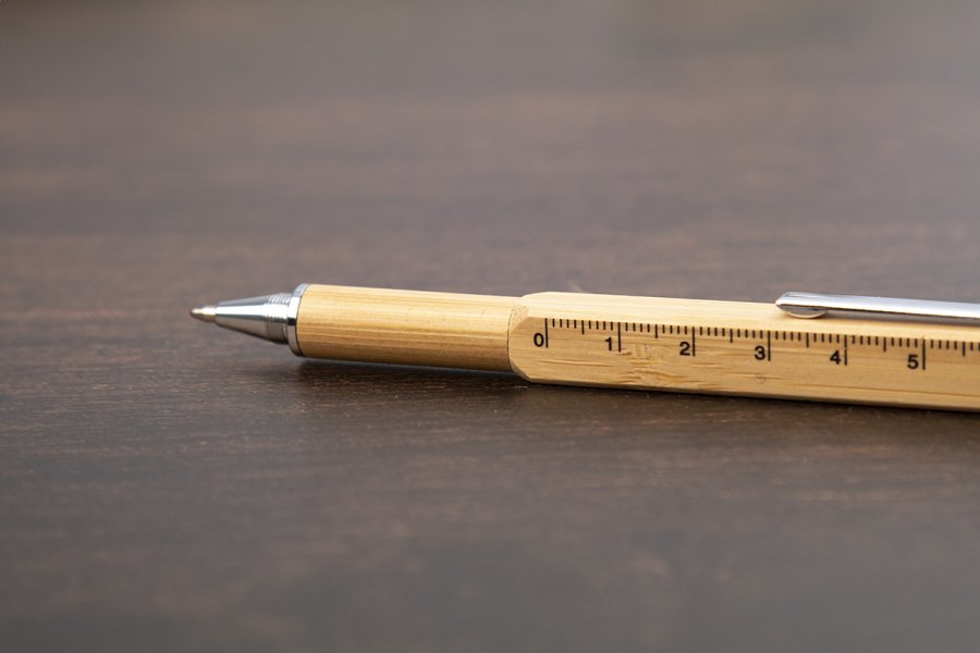 Multifunkční otočné kuličkové a dotykové pero z bambusu. S oboustranným šroubovákem, vodováhou a pravítkem 7 cm. S modrou náplní.