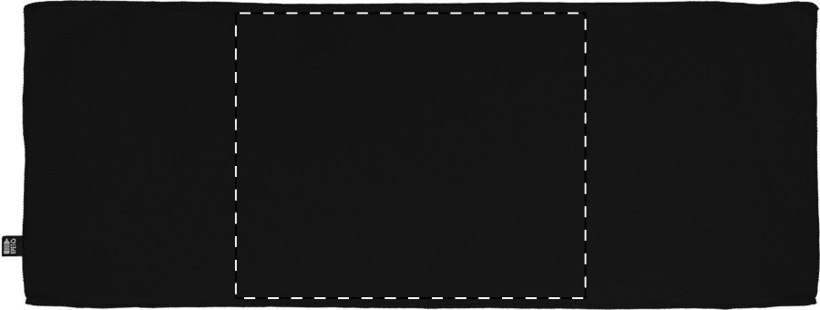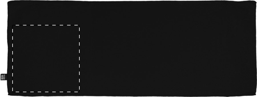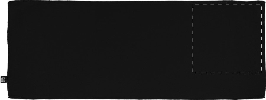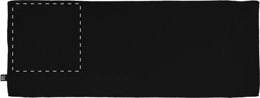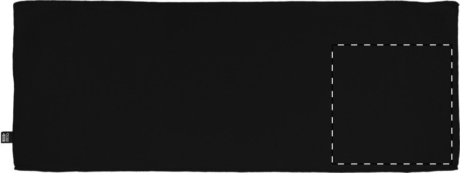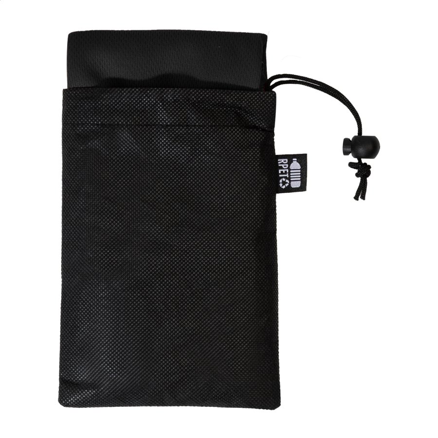 Sportovní ručník z mikrovlákna RPET v přepravním pouzdře z netkané tkaniny RPET s charakteristickou etiketou RPET. Polyester RPET, 140 g/m².