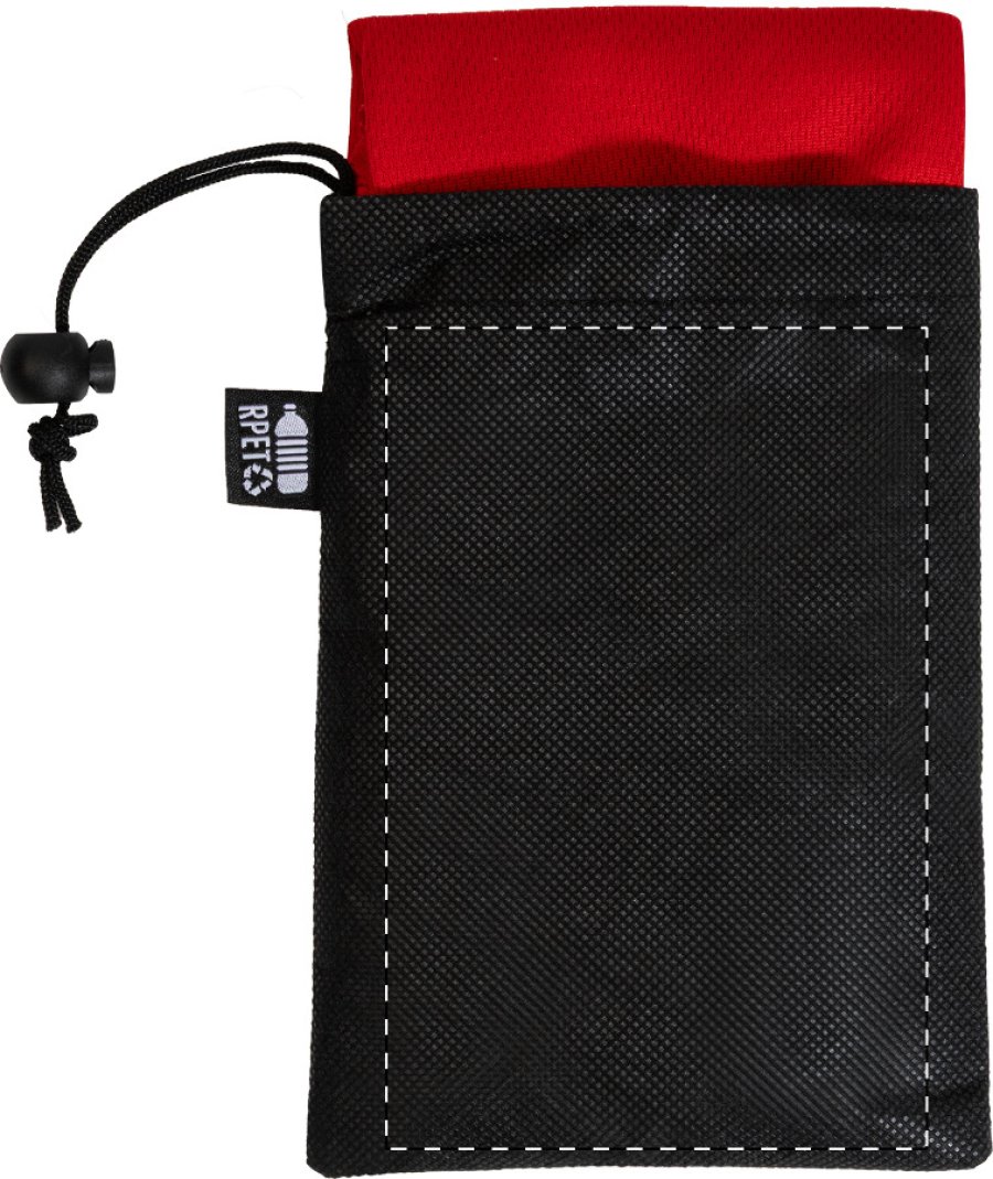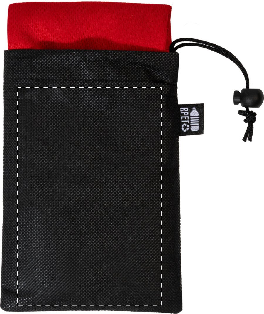 Sportovní ručník z mikrovlákna RPET v přepravním pouzdře z netkané tkaniny RPET s charakteristickou etiketou RPET. Polyester RPET, 140 g/m².