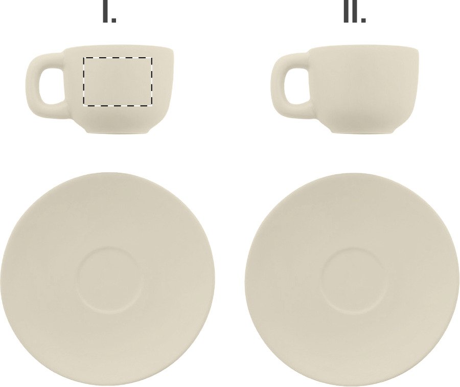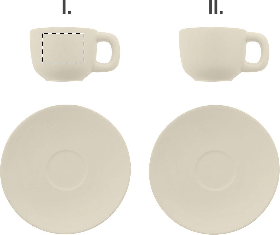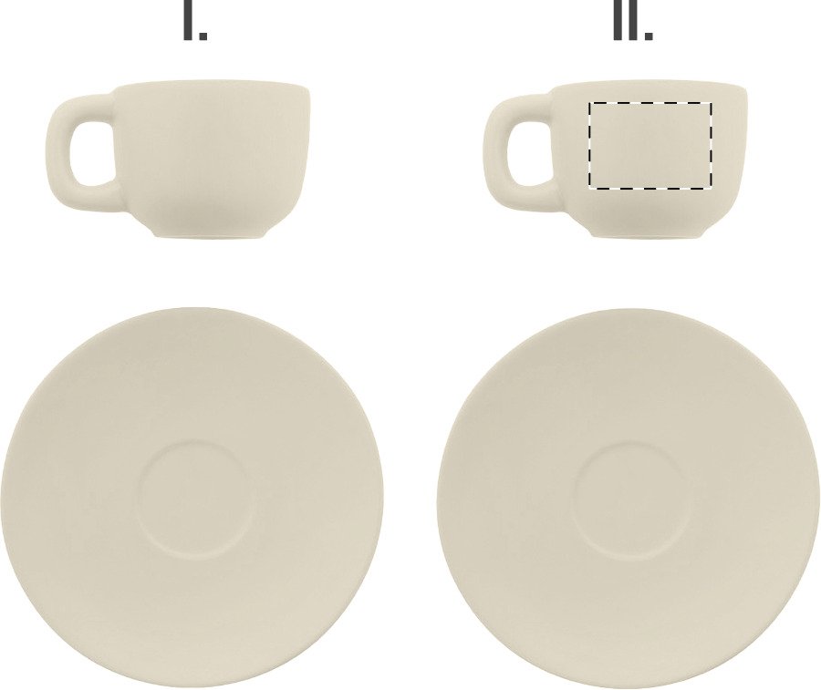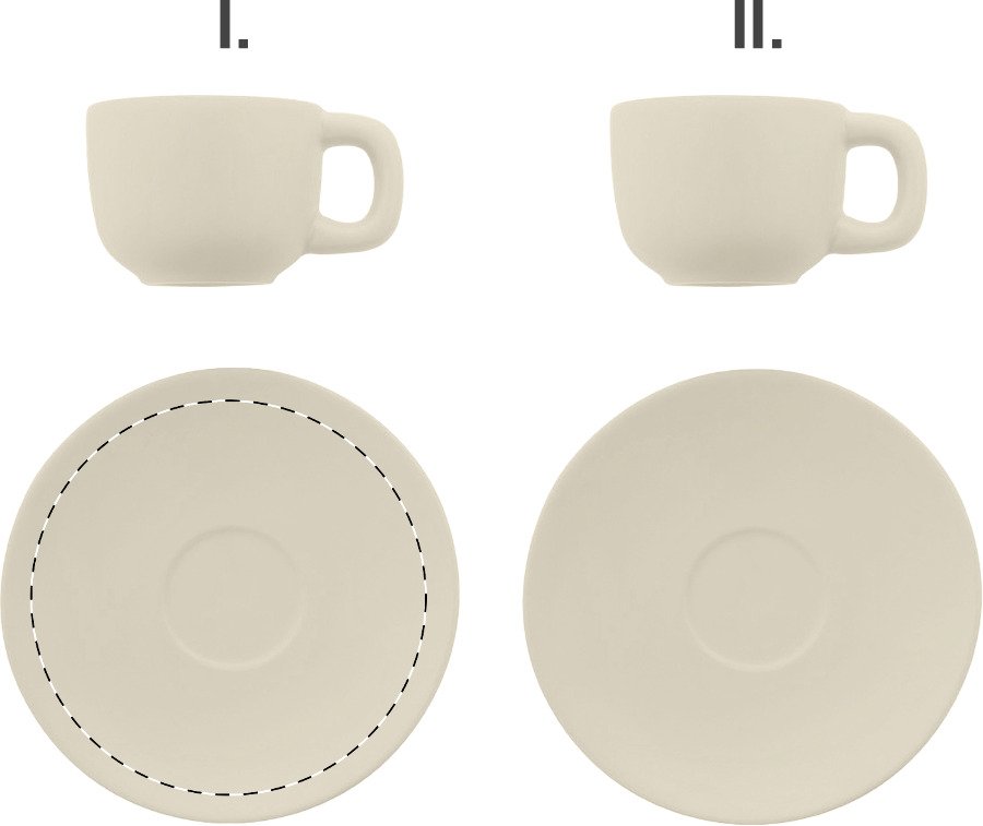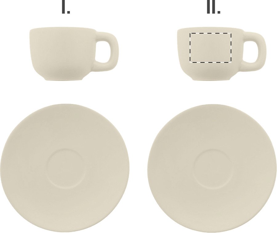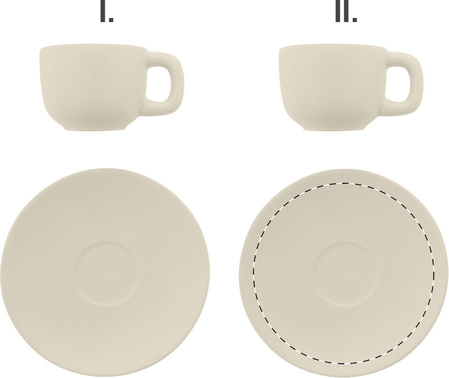 Vysoce kvalitní sada keramických šálků na espresso se 2 šálky a podšálky. S matnou vnější a lesklou vnitřní povrchovou úpravou. 85 ml. V kraftové papírové krabici.