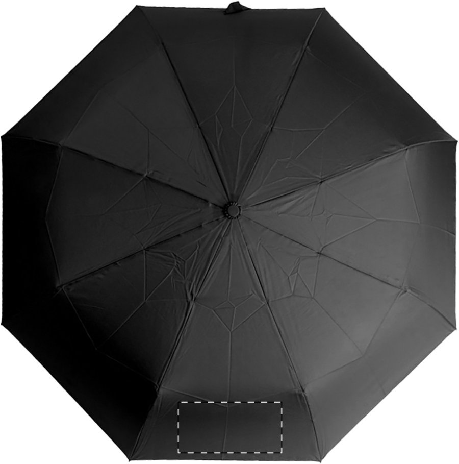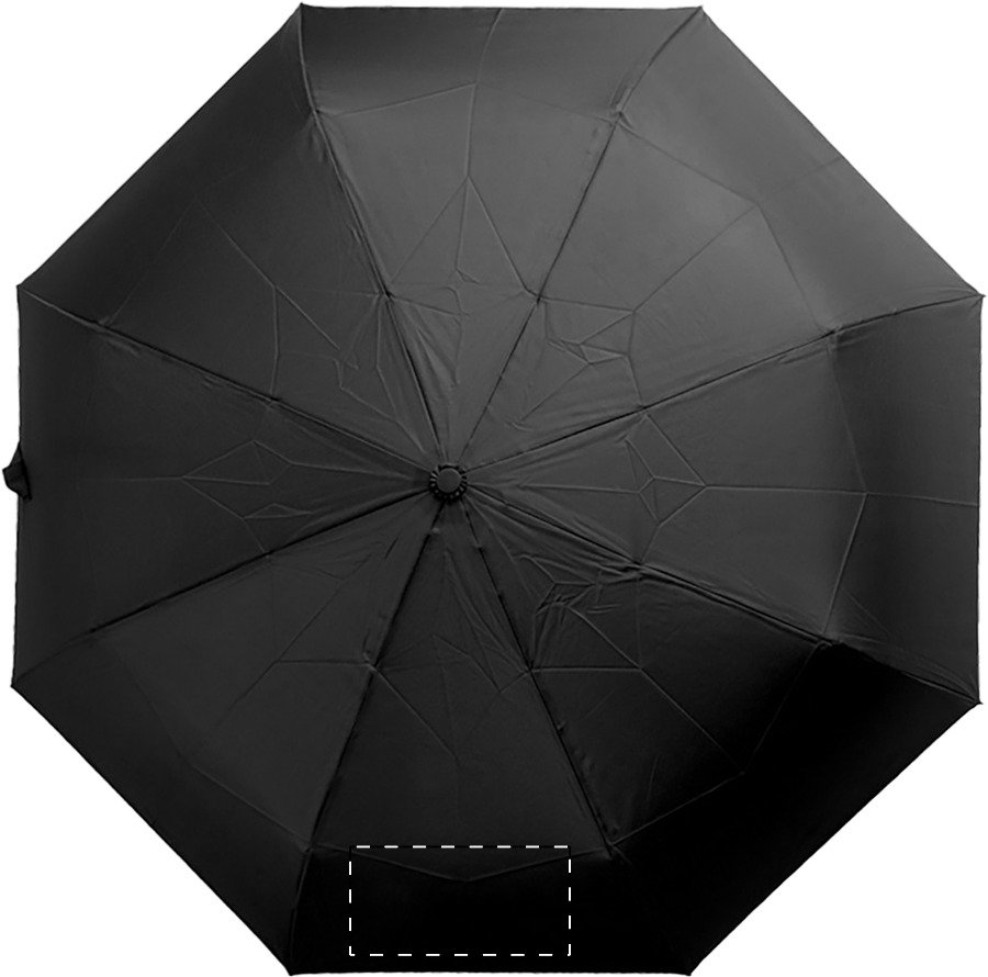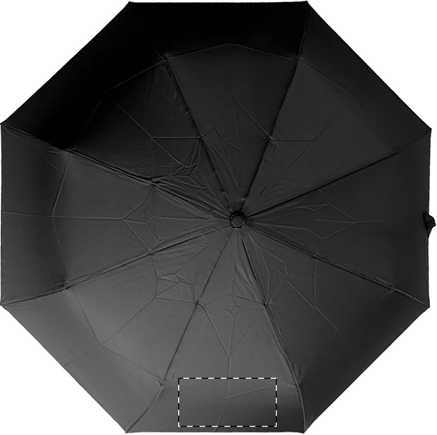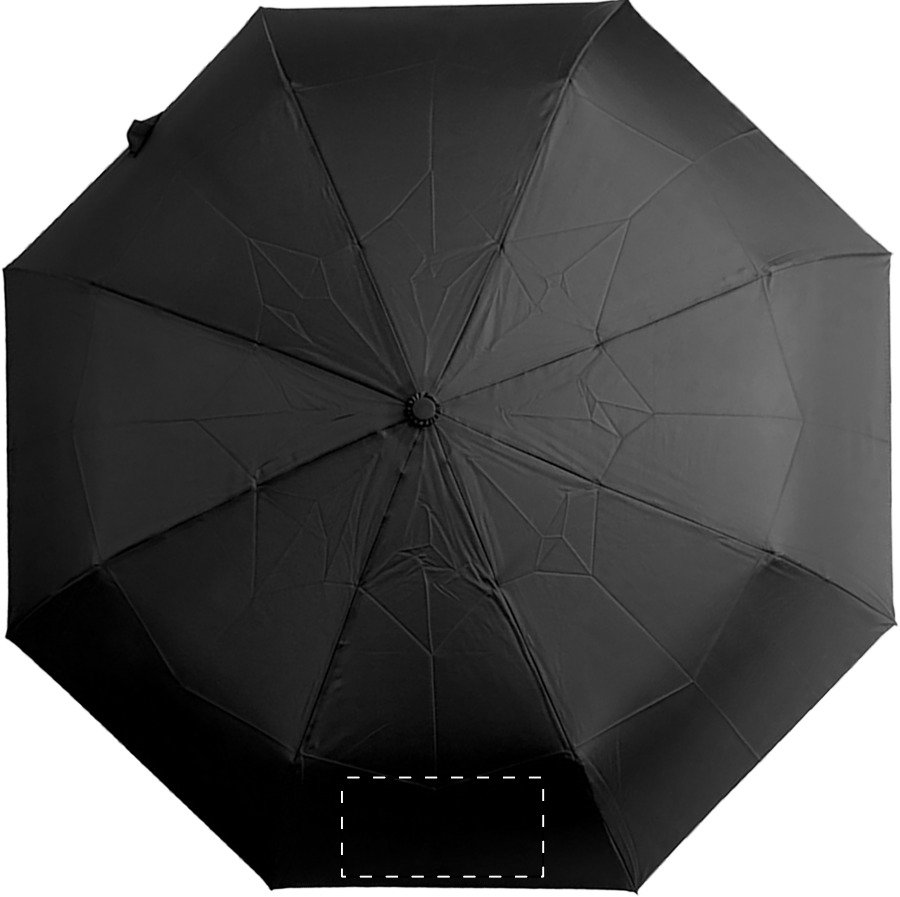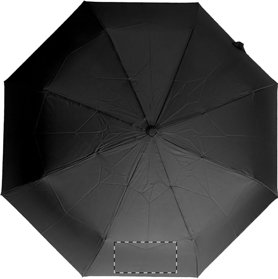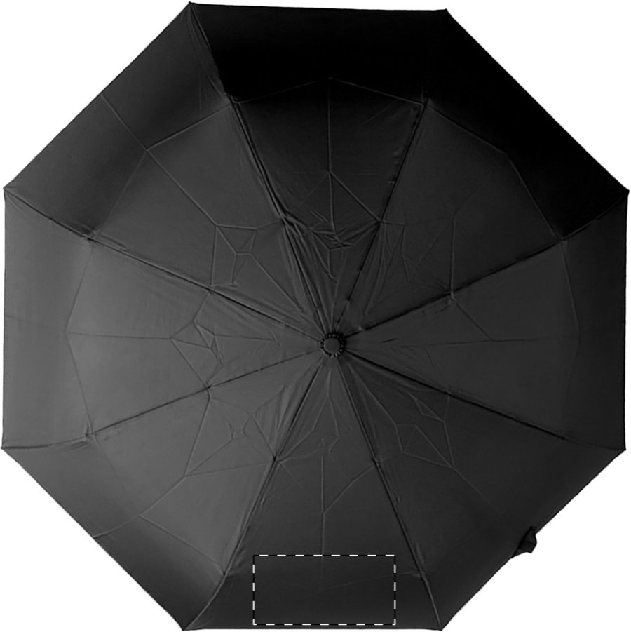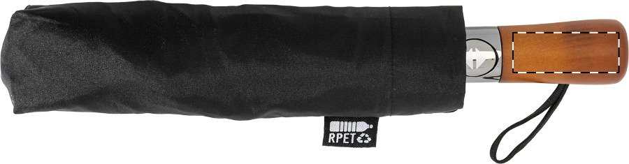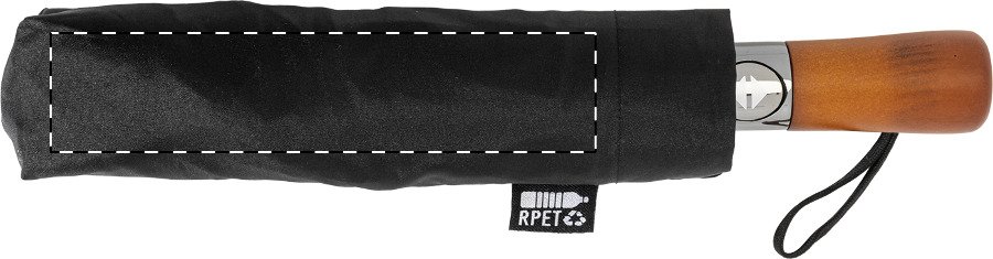 Velký, plně automatický (otevřít/zavřít) větruodolný skládací deštník s 8 panely a elegantní dřevěnou rukojetí s poutkem na ruku. S kovovým rámem a žebry ze skelných vláken. 190T RPET pongee. S charakteristickým RPET štítkem.