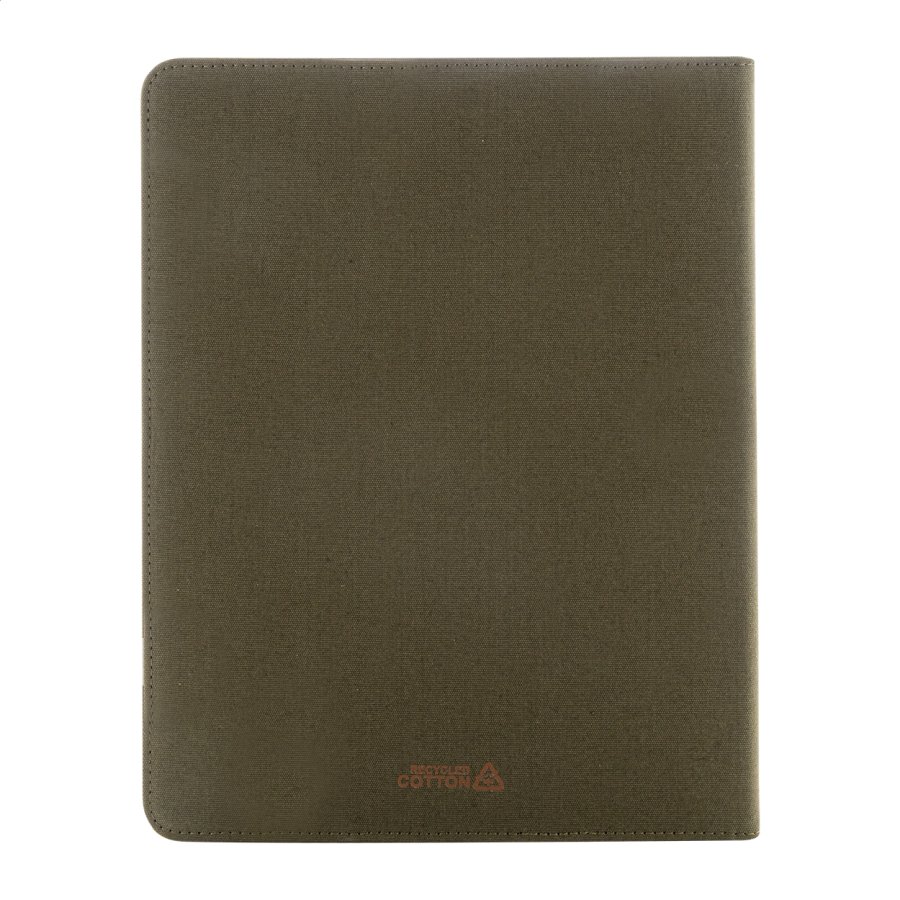 Složka na dokumenty A4 z recyklovaného plátna a recyklované umělé kůže s několika předními a vnitřními kapsami. S blokem na 20 linkovaných listů z recyklovaného papíru. 70 % recyklované bavlny a 30 % RPET polyesteru.