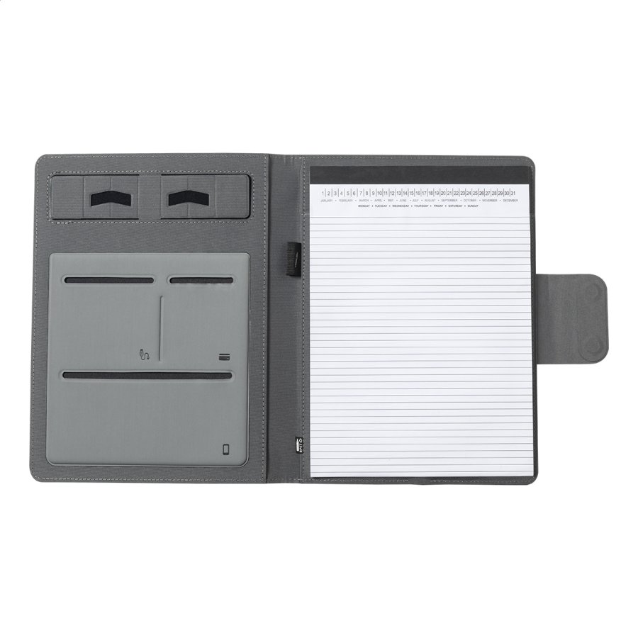 Polyesterová sloha na dokumenty A4 z 300D RPET s vestavěnou magnetickou bezdrátovou rychlonabíječkou (10W), powerbankou 5000 mAh s USB portem pro nabíjení, skládacím držákem na mobil a 20 linkovaným poznámkovým blokem. Včetně samolepícího kovového kroužku pro použití magnetické funkce na jakémkoli bezdrátově nabíjecím zařízení. Včetně USB nabíjecího kabelu.