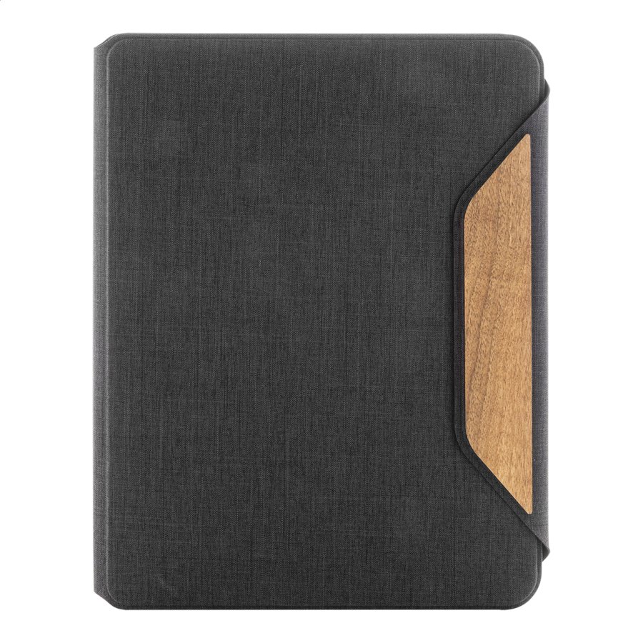 Složka na dokumenty A4 z RPET polyesteru s několika vnitřními kapsami a magnetickým zapínáním s detaily z ořechového dřeva. S linkovaným blokem z recyklovaného papíru s 20 listy.