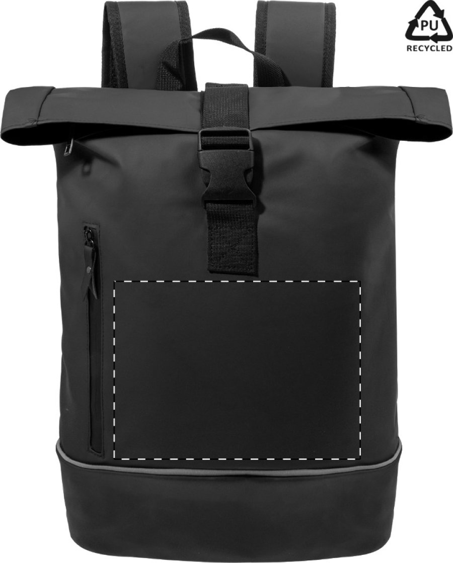 Voděodolný batoh s rolovacím vrškem z měkké recyklované PU kůže s hlavní přihrádkou na zip a zapínáním na přezku, přední kapsou s voděodolným zipem, polstrovanou přihrádkou na notebook (15") a reflexním proužkem. S polstrovanými zády a ramenními popruhy. S výraznou nálepkou z recyklované PU kůže.