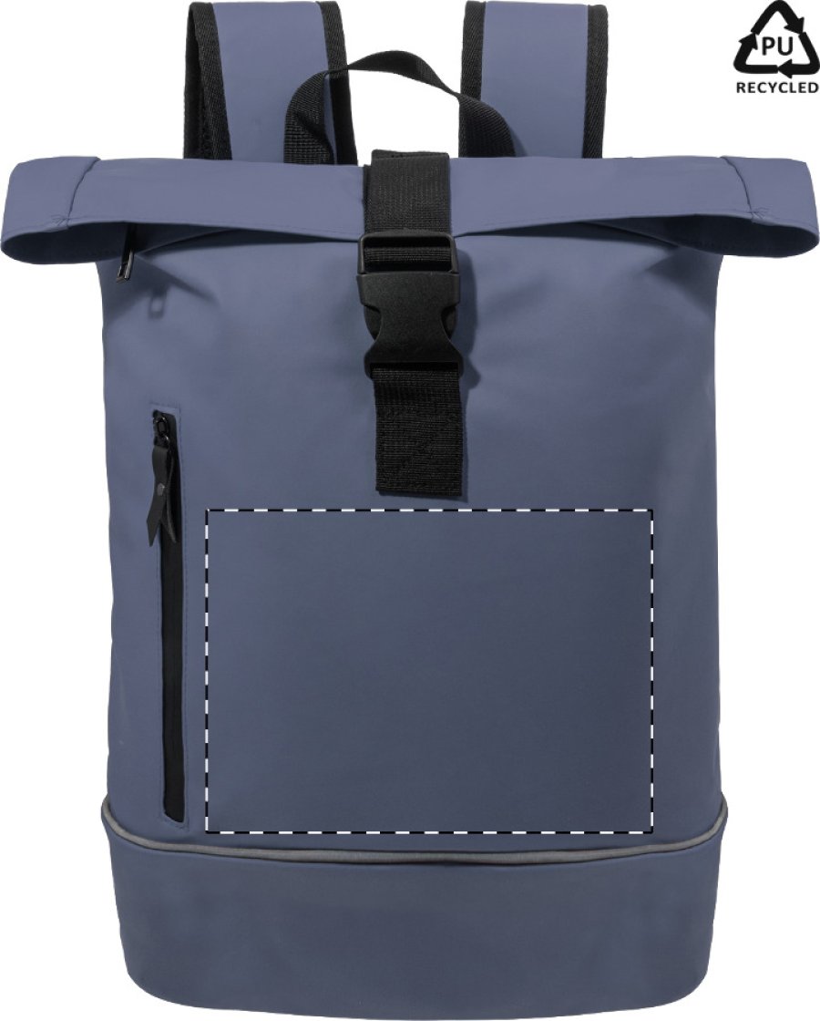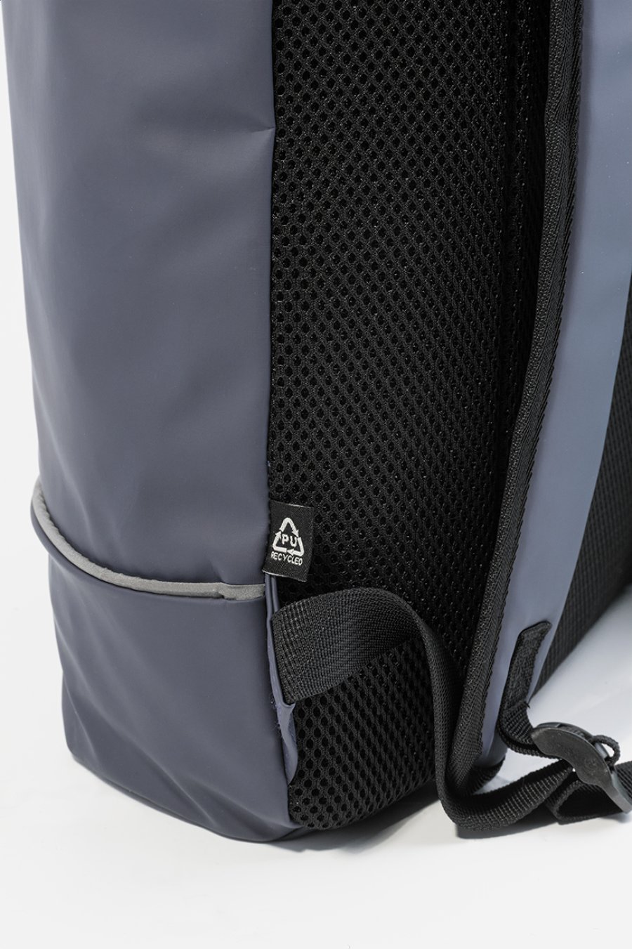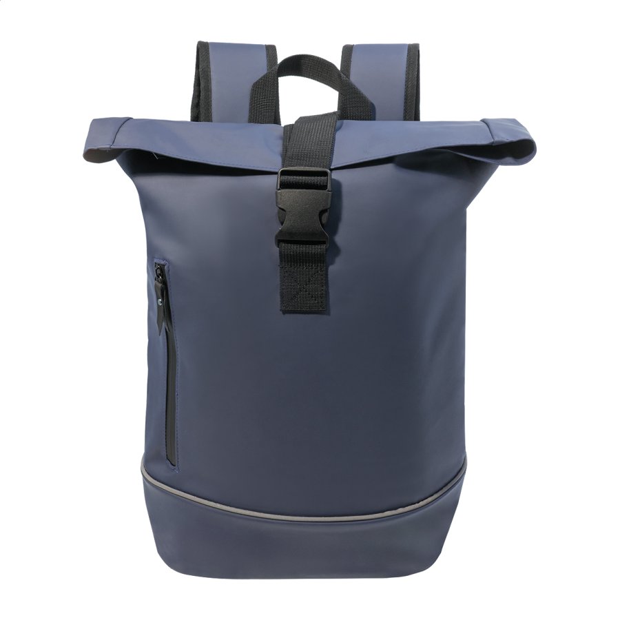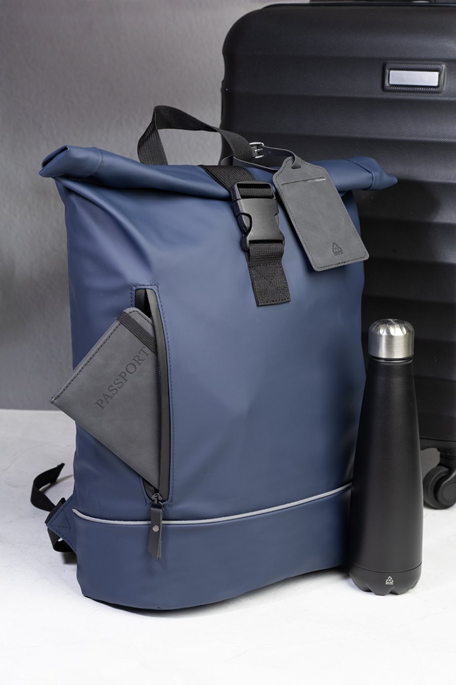 Voděodolný batoh s rolovacím vrškem z měkké recyklované PU kůže s hlavní přihrádkou na zip a zapínáním na přezku, přední kapsou s voděodolným zipem, polstrovanou přihrádkou na notebook (15") a reflexním proužkem. S polstrovanými zády a ramenními popruhy. S výraznou nálepkou z recyklované PU kůže.