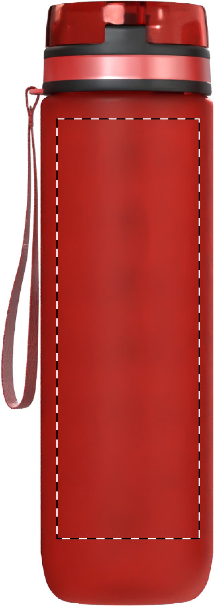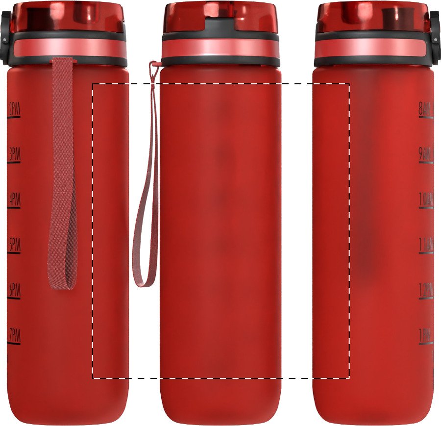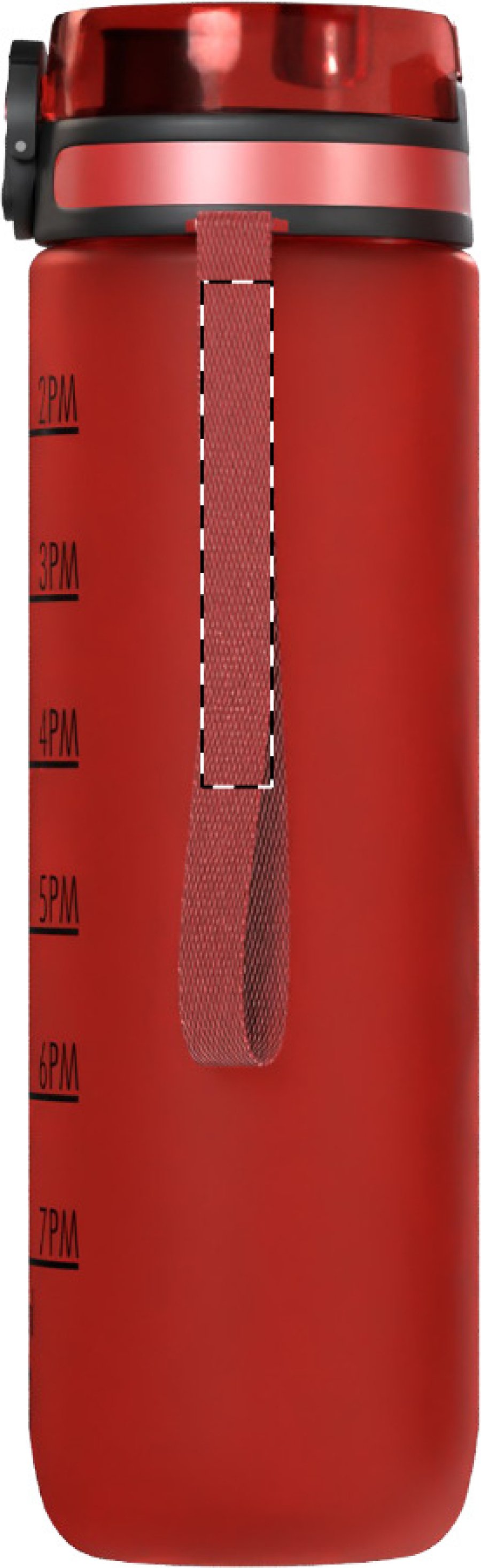 Sportovní láhev z matného RPET s motivačním objemovým a časovým značením, s automaticky otevíratelným odklápěcím víčkem s bezpečnostním zámkem a poutkem na nošení. 1000 ml. Bez BPA. Nevhodné pro sycené nápoje.