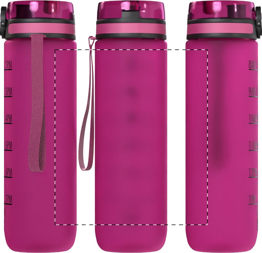 Sportovní láhev z matného RPET s motivačním objemovým a časovým značením, s automaticky otevíratelným odklápěcím víčkem s bezpečnostním zámkem a poutkem na nošení. 1000 ml. Bez BPA. Nevhodné pro sycené nápoje.