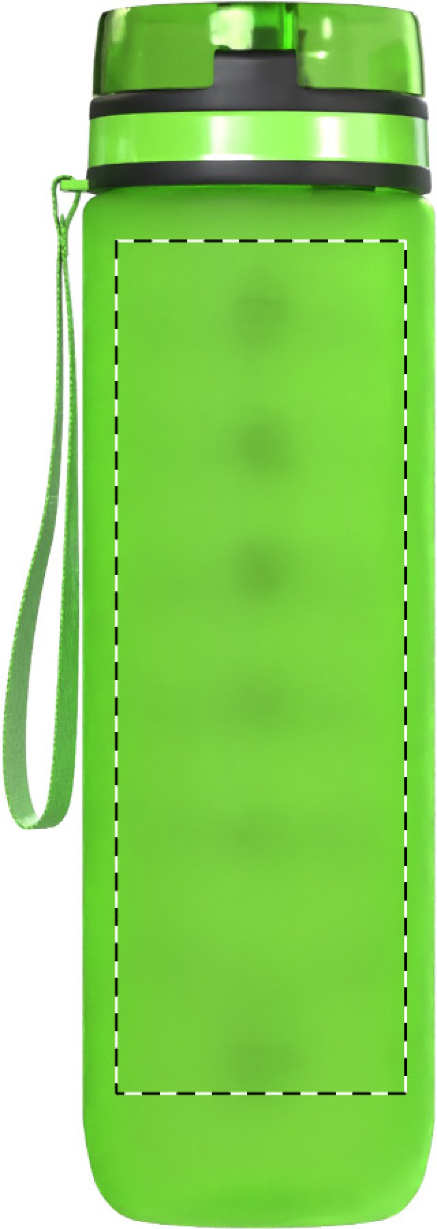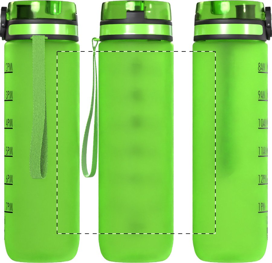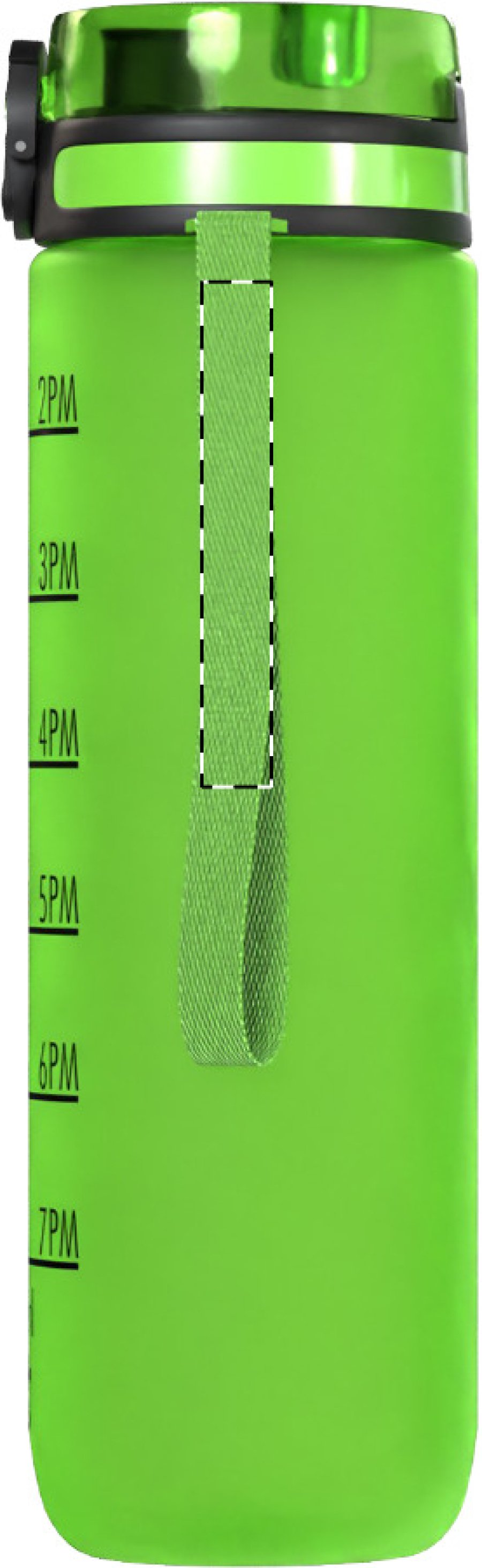 Sportovní láhev z matného RPET s motivačním objemovým a časovým značením, s automaticky otevíratelným odklápěcím víčkem s bezpečnostním zámkem a poutkem na nošení. 1000 ml. Bez BPA. Nevhodné pro sycené nápoje.