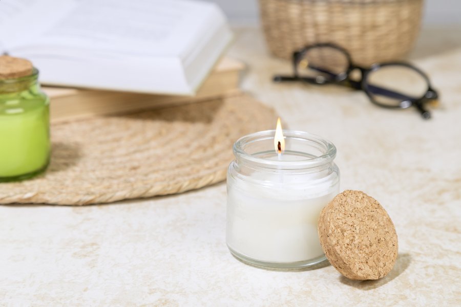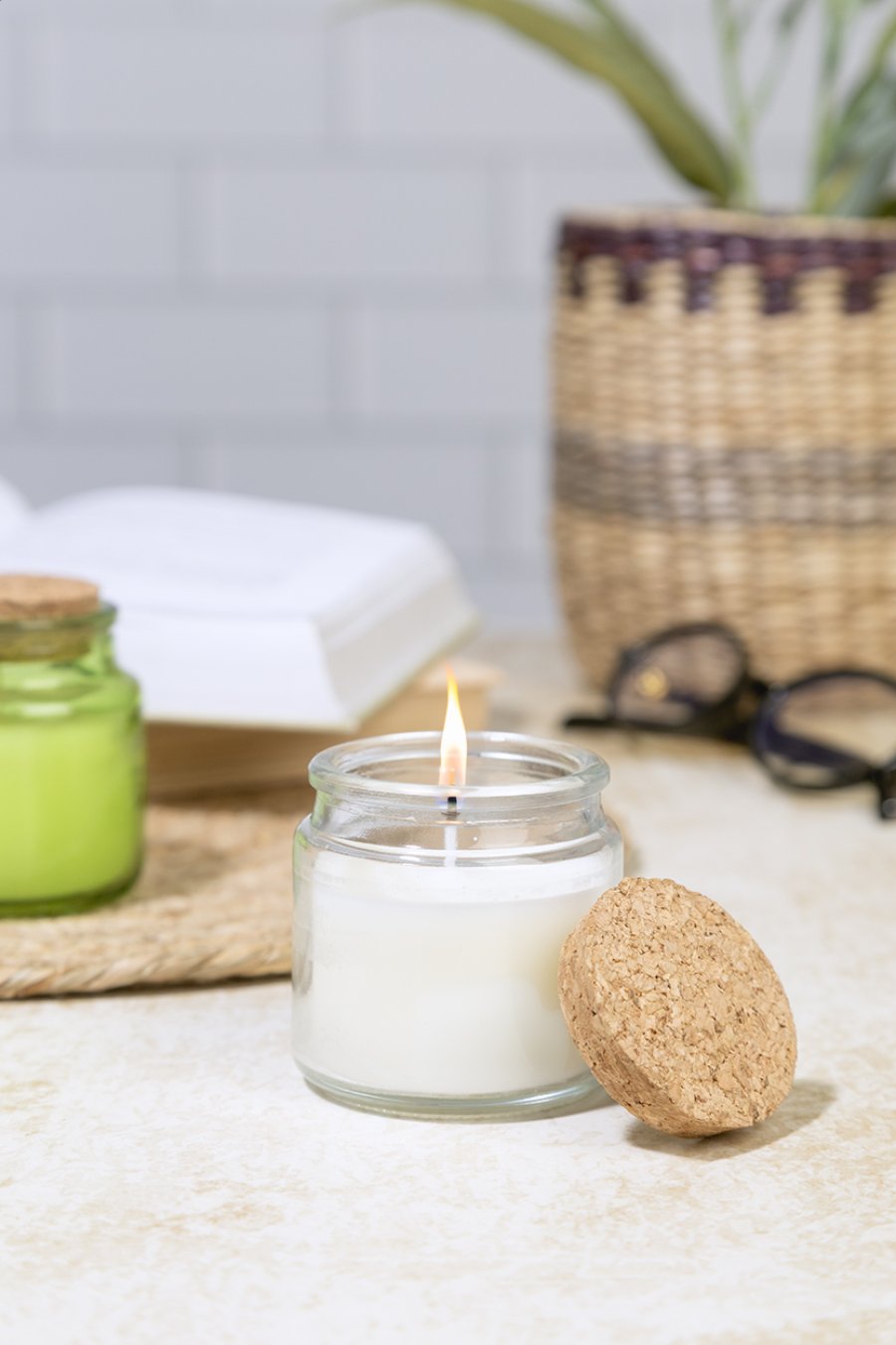 Vosková svíčka z rostlinného vosku s vůní vanilky ve skleněném svícnu s víčkem z přírodního korku. S 80 gramy vosku. Do ba hoření: 16 hodin. V krabičce z kraftového papíru.