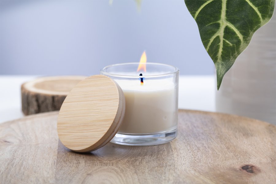 Rostlinná vosková svíčka s vůní vanilky ve skleněném držáku s bambusovým víčkem. S 95 gramy vosku. V kraftové papírové krabici.