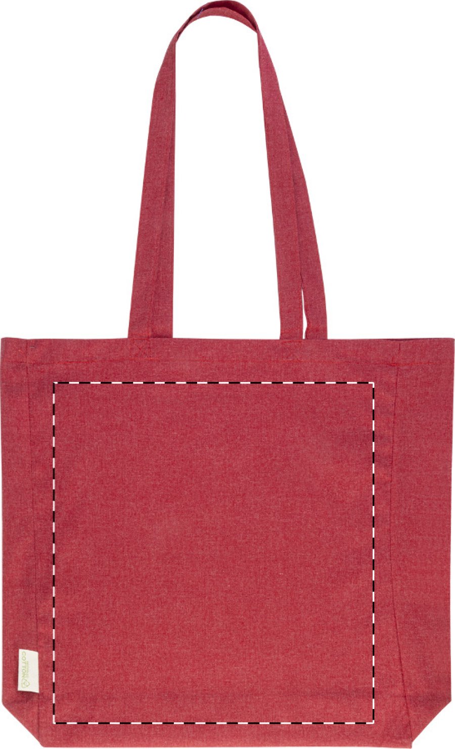 Nákupní taška s klínkem a dlouhými uchy ze 70 % recyklované bavlny a 30 % RPET polyesteru, 140 g/m². S výraznou etiketou o recyklované bavlně.