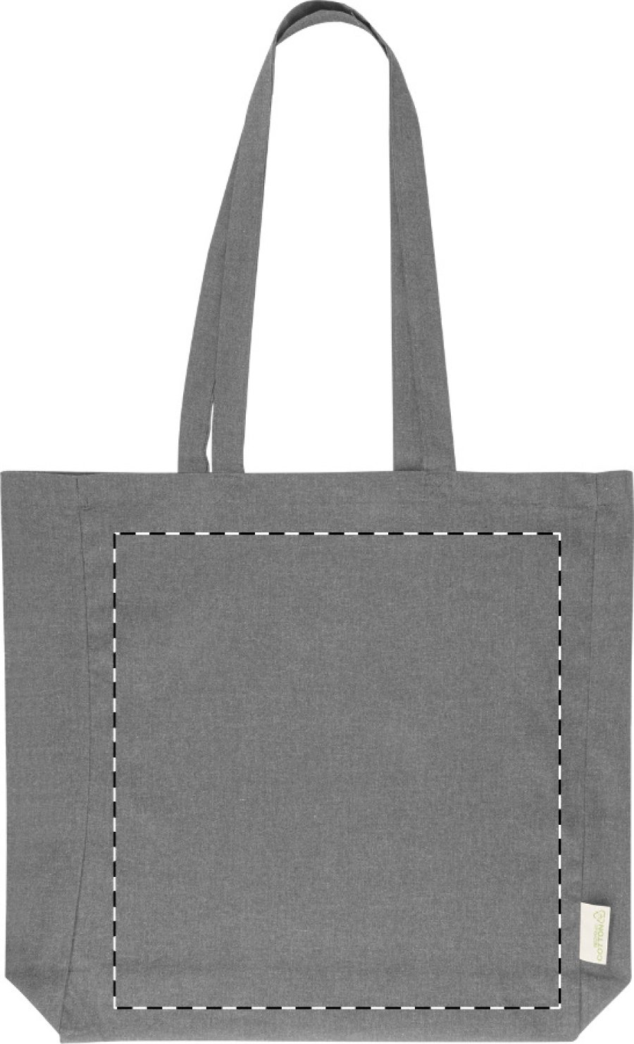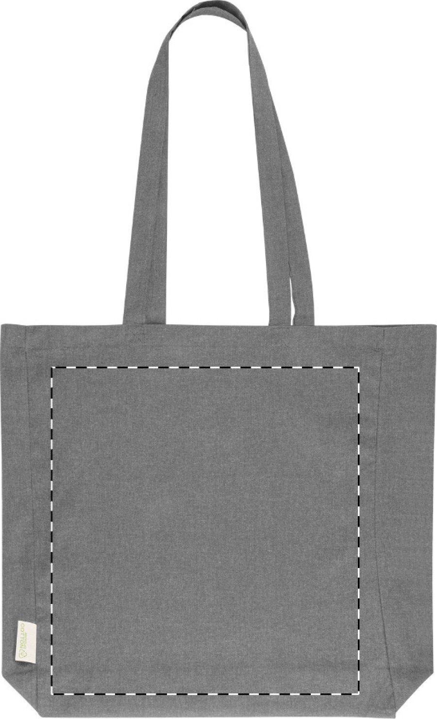 Nákupní taška s klínkem a dlouhými uchy ze 70 % recyklované bavlny a 30 % RPET polyesteru, 140 g/m². S výraznou etiketou o recyklované bavlně.