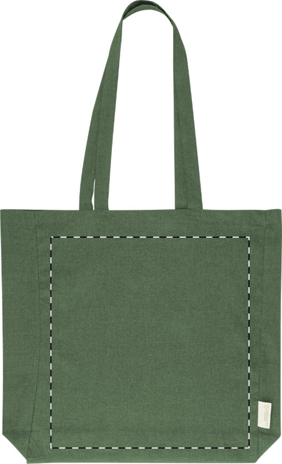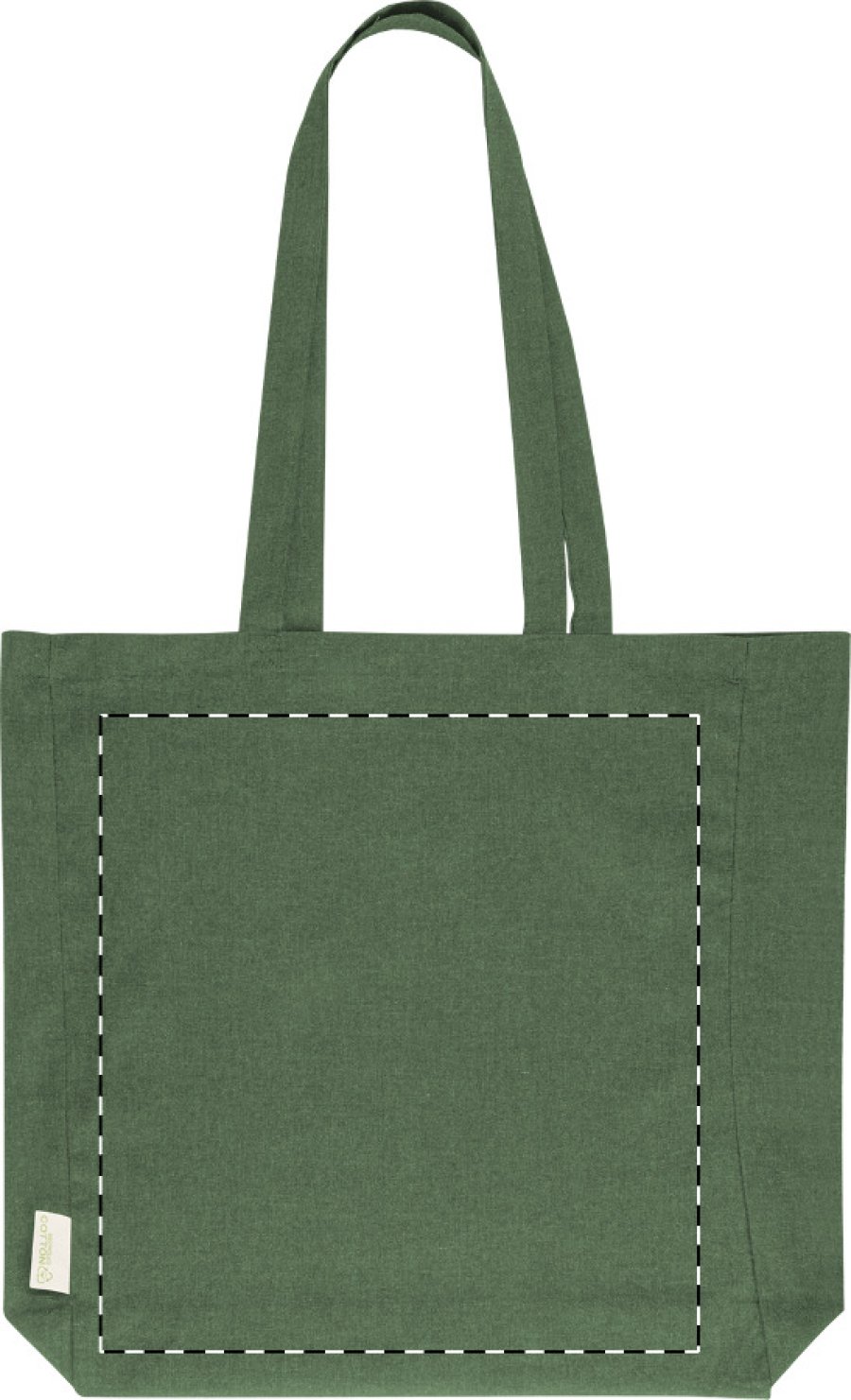 Nákupní taška s klínkem a dlouhými uchy ze 70 % recyklované bavlny a 30 % RPET polyesteru, 140 g/m². S výraznou etiketou o recyklované bavlně.