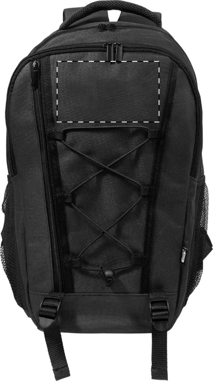Outdoorový batoh z RPET s přihrádkami na zip a přední kapsou, polstrovanou přihrádkou na notebook (15"), síťovanými bočními kapsami a elastickými šňůrkami vpředu. S polstrovanými zády a ramenními popruhy. Polyester 600D RPET s výrazným štítkem RPET.