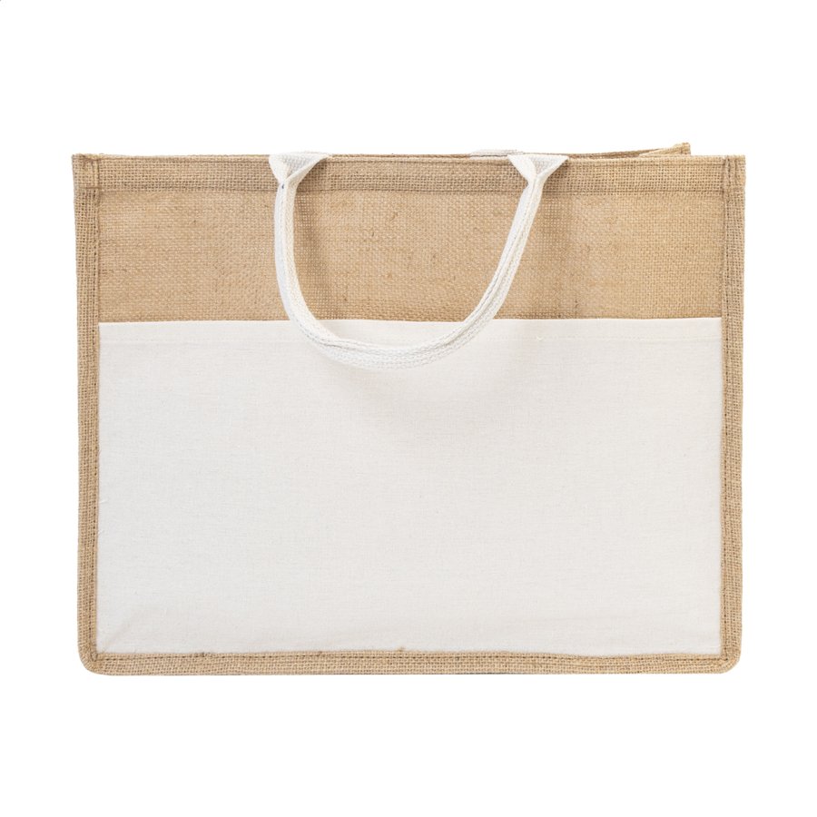 Plážová taška z laminované juty s bavlněnými uchy a přední kapsou.