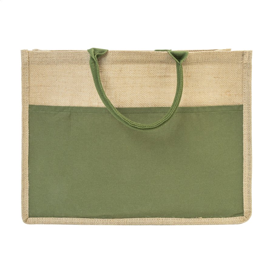 Plážová taška z laminované juty s bavlněnými uchy a přední kapsou.