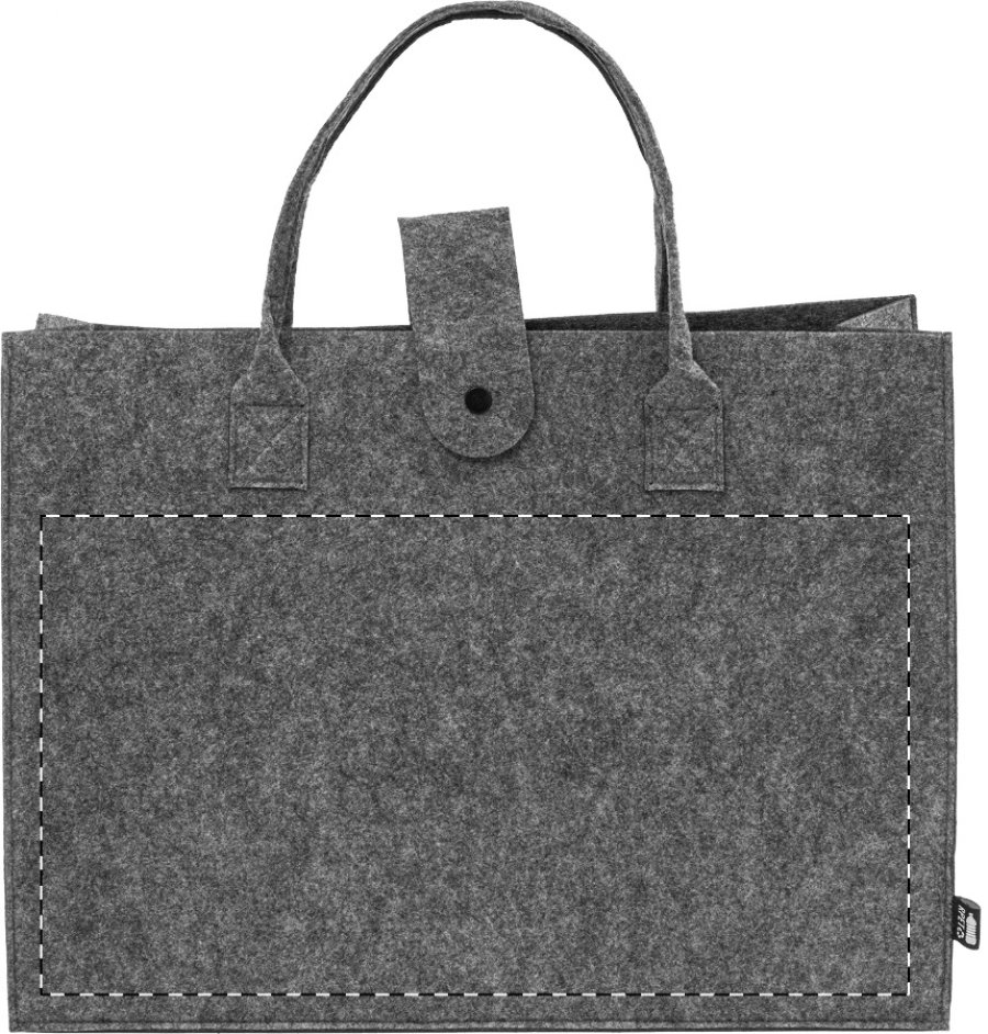 Nákupní taška z RPET plsti s klínkem, zapínáním na knoflíky a krátkými uchy. S výraznou etiketou z RPET.