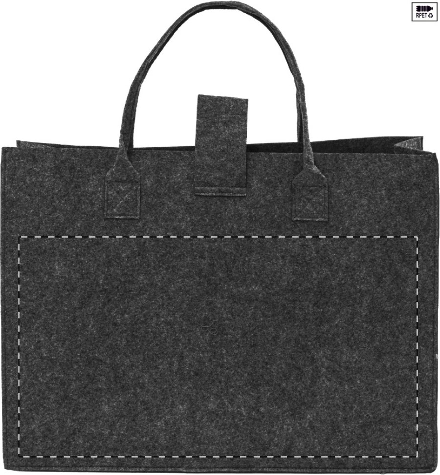 Nákupní taška z RPET plsti s klínkem, zapínáním na knoflíky a krátkými uchy. S výraznou etiketou z RPET.