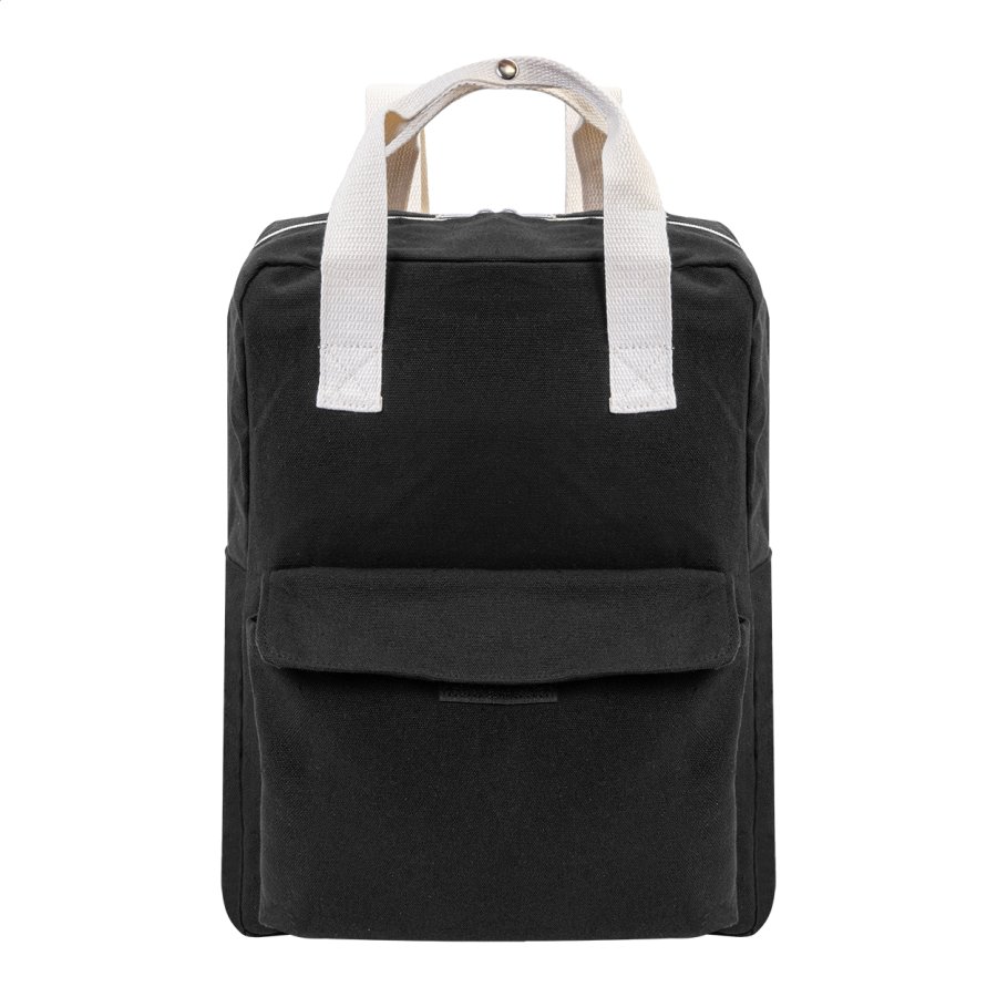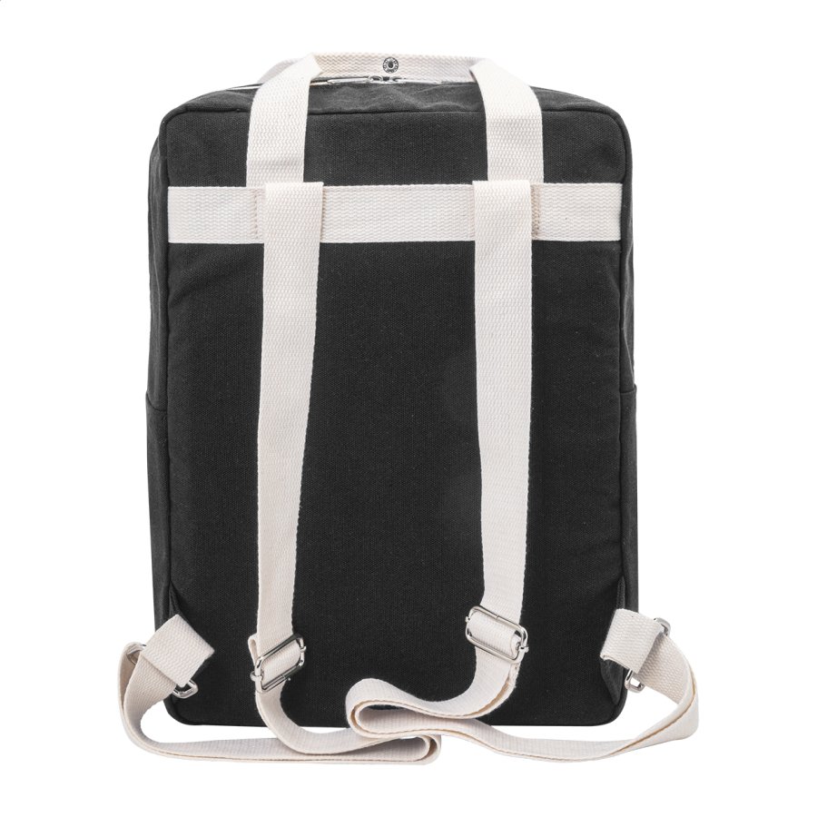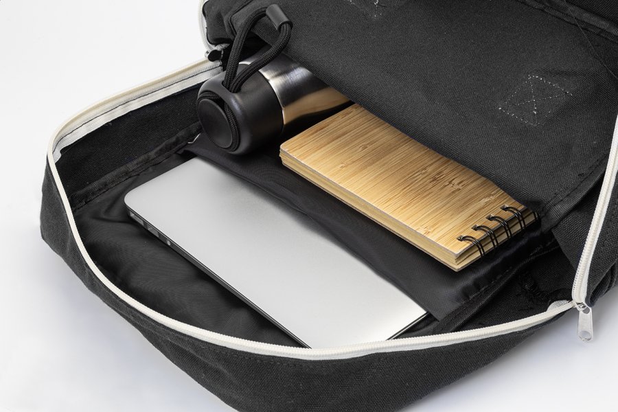 Batoh z recyklovaného plátna s hlavní přihrádkou na zip, polstrovanou přihrádkou na notebook (13") a přední kapsou na suchý zip. 70 % recyklované bavlny a 30 % RPET polyesteru. S výraznou etiketou o recyklované bavlně.