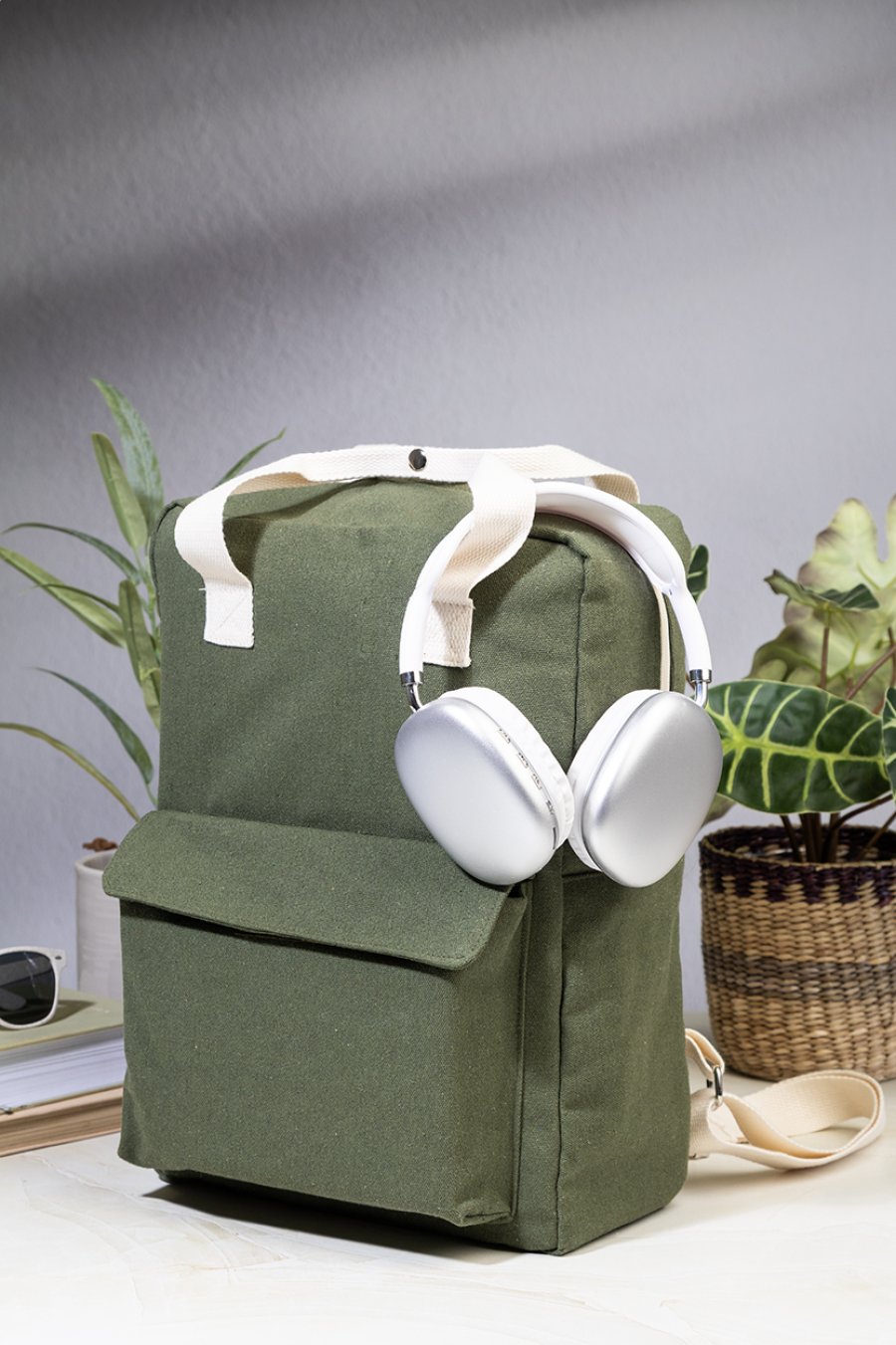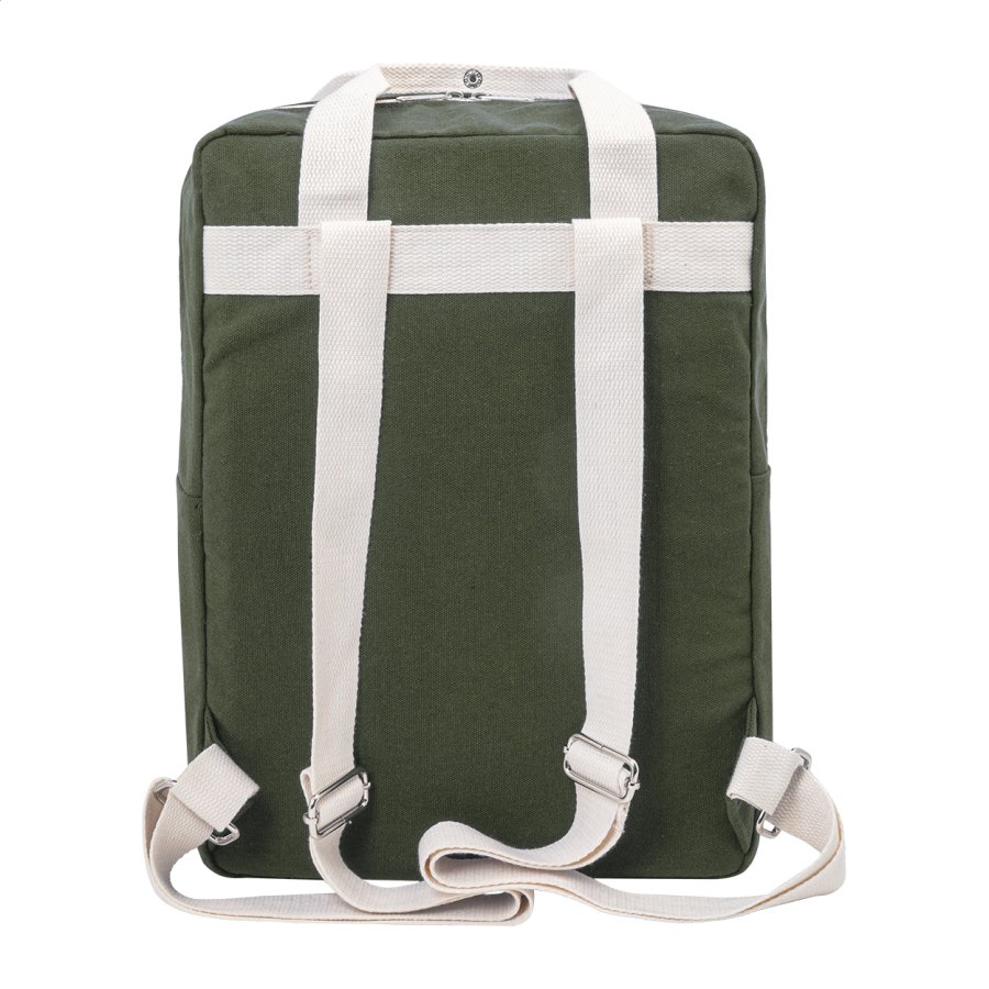 Batoh z recyklovaného plátna s hlavní přihrádkou na zip, polstrovanou přihrádkou na notebook (13") a přední kapsou na suchý zip. 70 % recyklované bavlny a 30 % RPET polyesteru. S výraznou etiketou o recyklované bavlně.