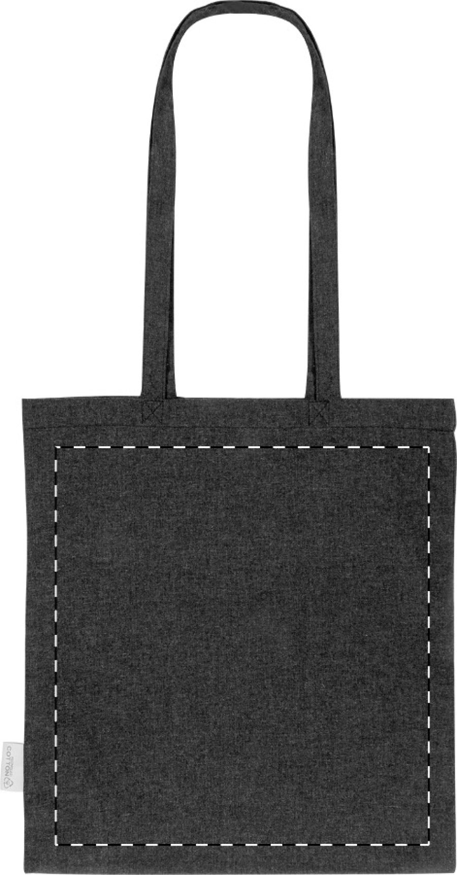 Nákupní taška s dlouhými uchy ze 70 % recyklované bavlny a 30 % RPET polyesteru, 140 g/m². S výraznou etiketou o recyklované bavlně.