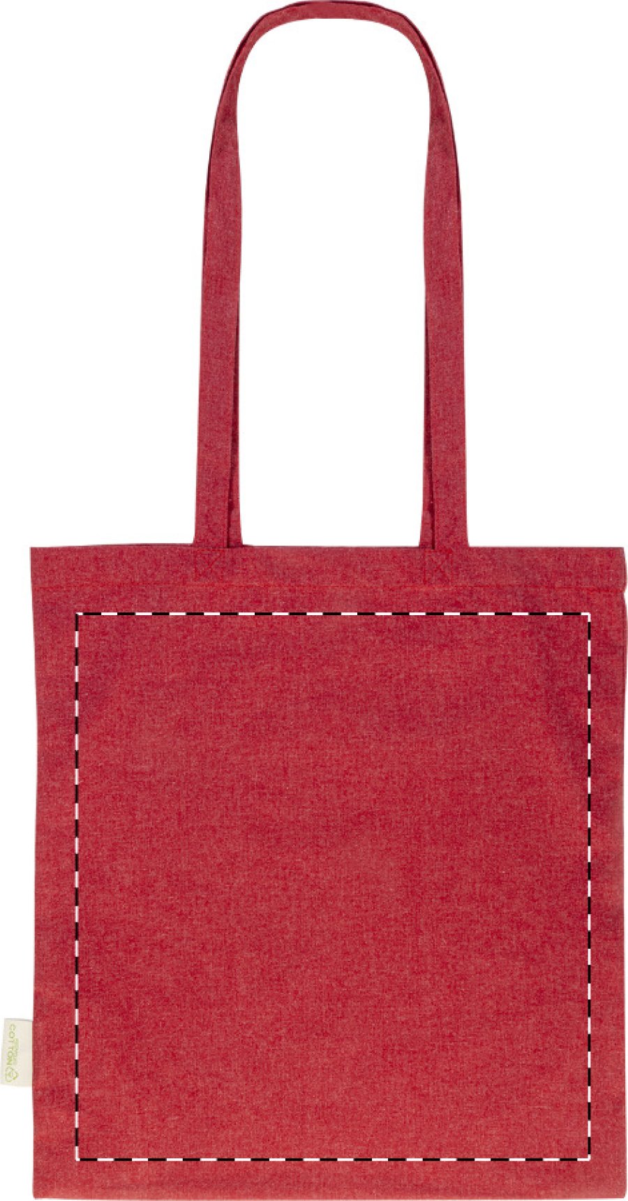 Nákupní taška s dlouhými uchy ze 70 % recyklované bavlny a 30 % RPET polyesteru, 140 g/m². S výraznou etiketou o recyklované bavlně.
