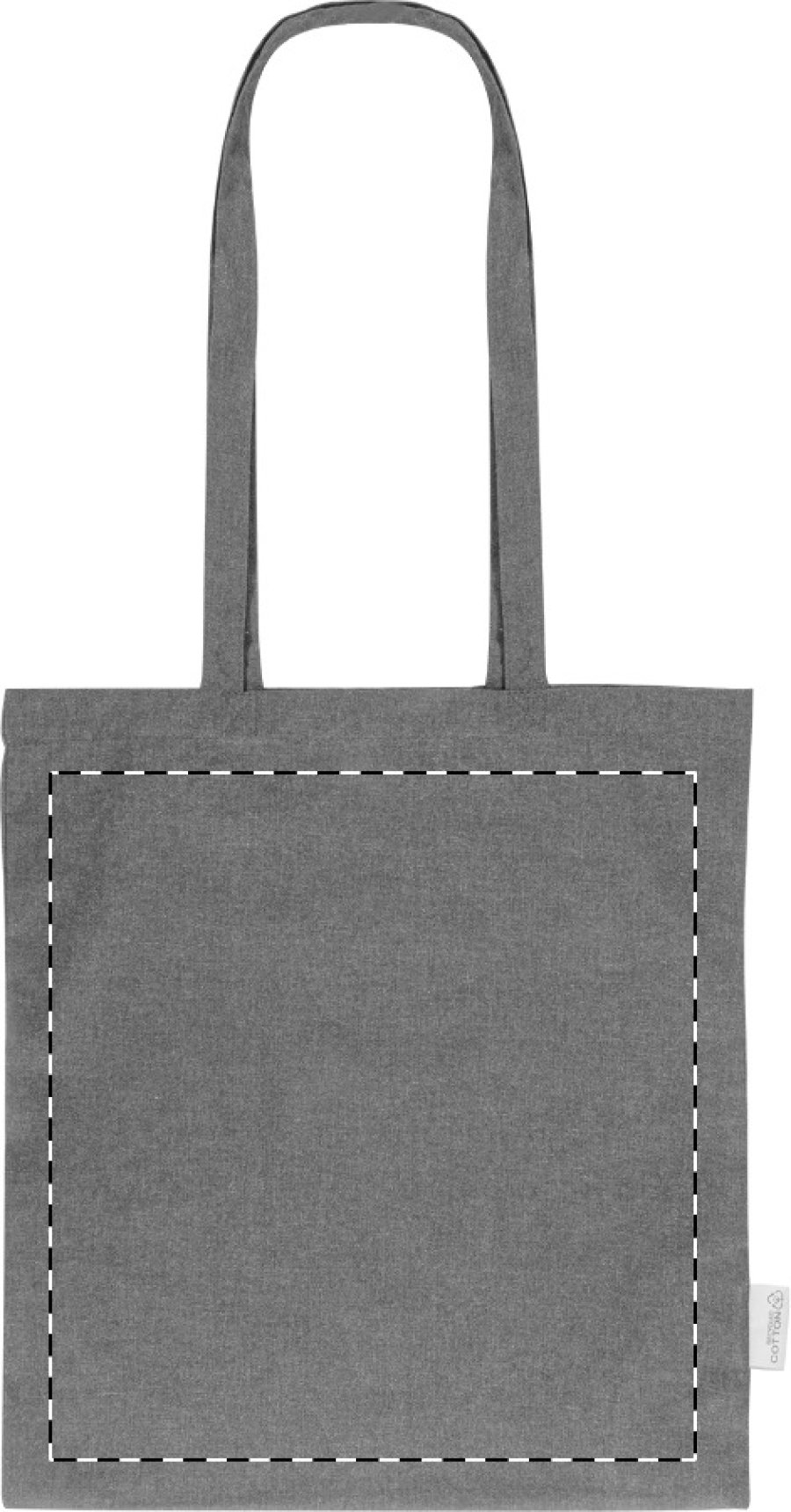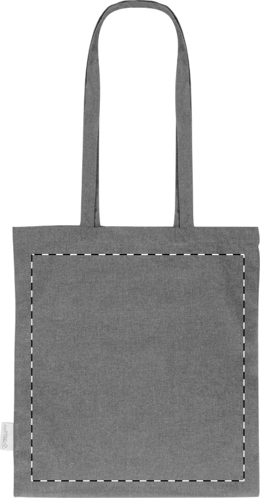 Nákupní taška s dlouhými uchy ze 70 % recyklované bavlny a 30 % RPET polyesteru, 140 g/m². S výraznou etiketou o recyklované bavlně.