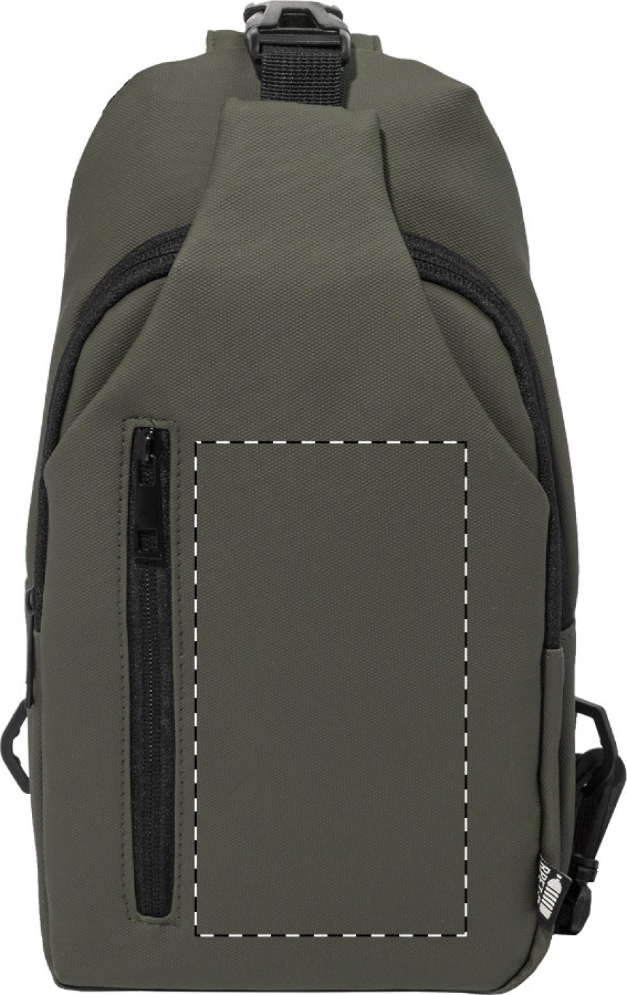 Voděodolná RPET crossbody taška na zavěšení přes rameno s kapsami na zip, zapínáním na přezku a polstrovanými zády. S nastavitelným ramenním popruhem vybaveným polohami na levé a pravé straně. Polyester RPET 600D potažený PU, s výraznou etiketou RPET.