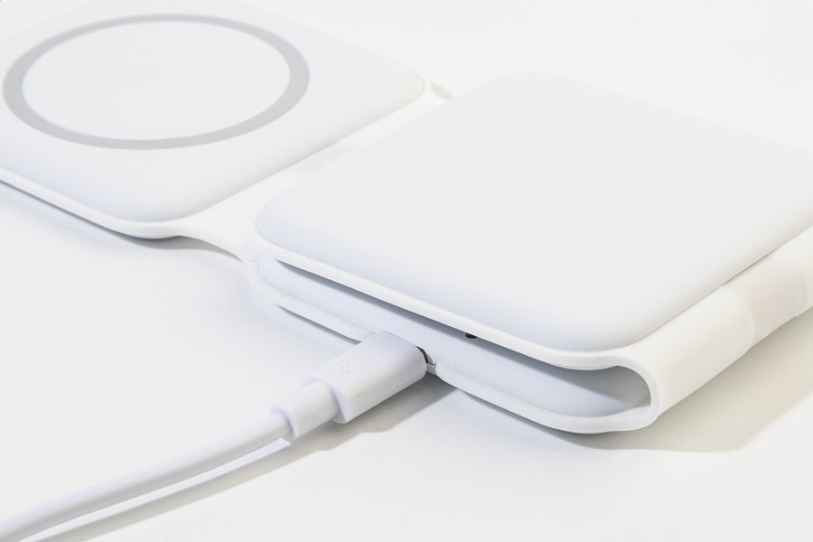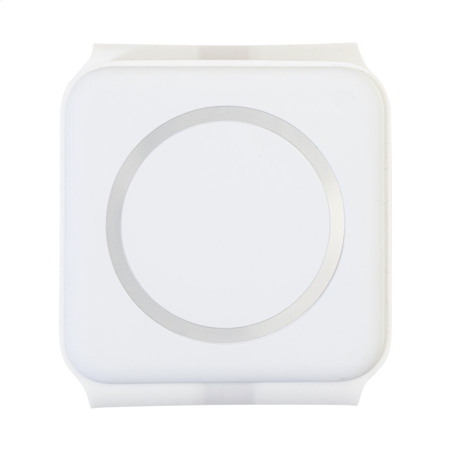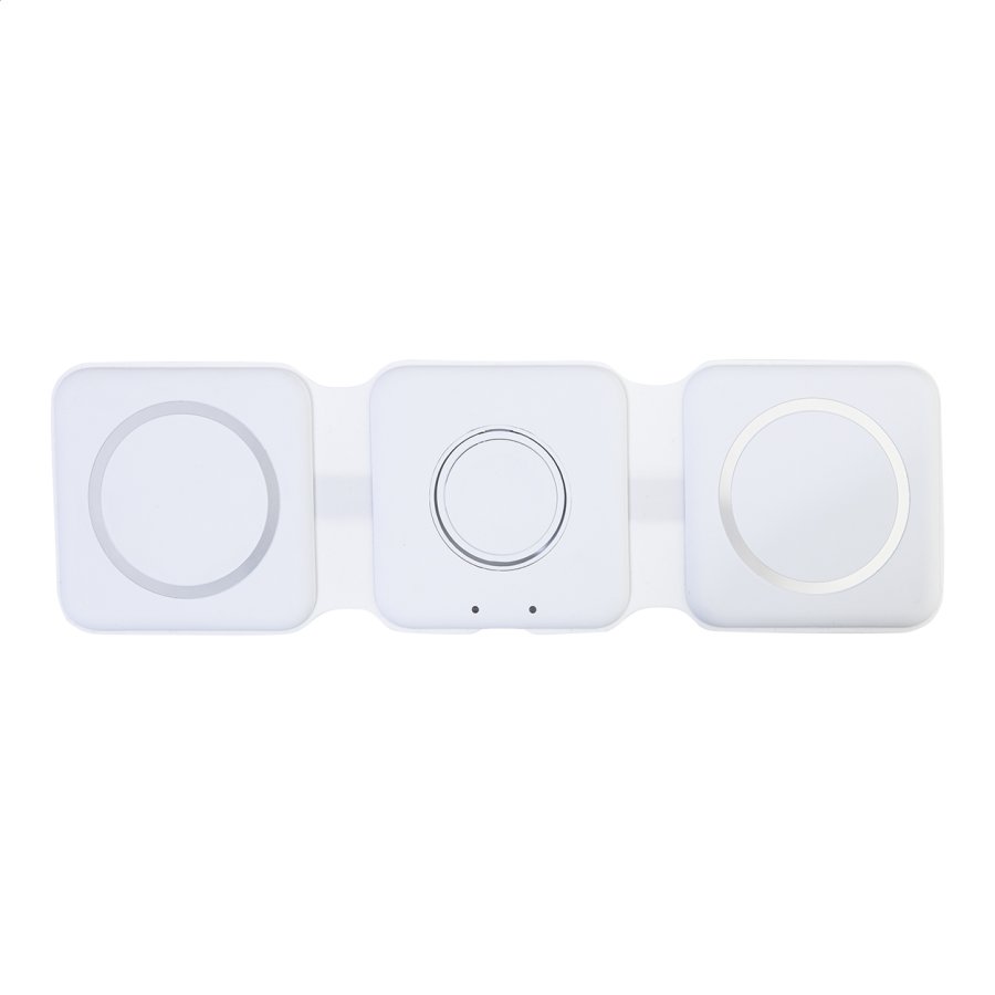 Skládací držák na mobilní telefon a bezdrátová nabíječka z recyklovaného ABS plastu. S magnetickou bezdrátovou rychlonabíječkou (15 W), bezdrátovou nabíječkou (5 W) pro sluchátka a bezdrátovou nabíječkou (2,5 W) pro chytré hodinky (pouze Apple®). Včetně samolepicího kovového kroužku pro telefony bez magnetického povrchu. Včetně USB nabíjecího kabelu.