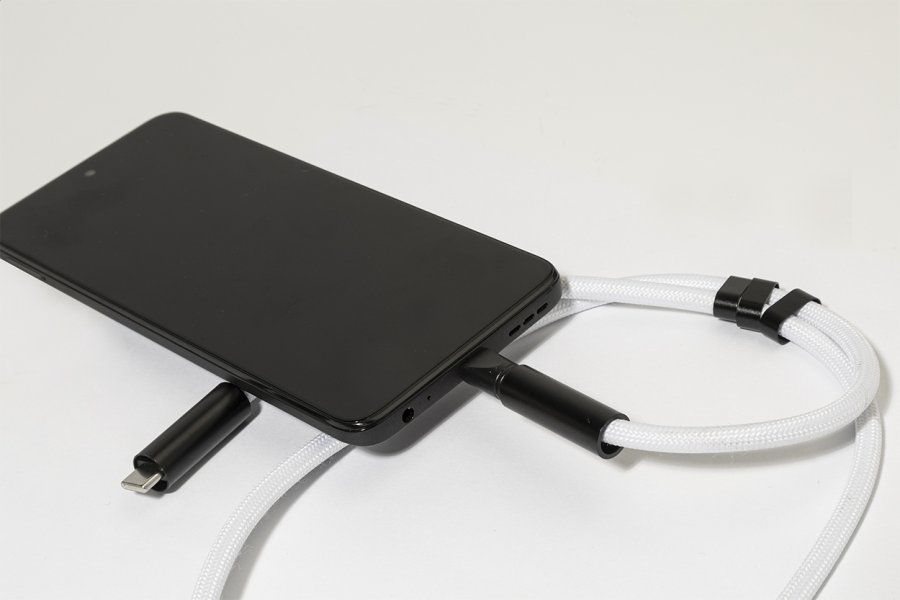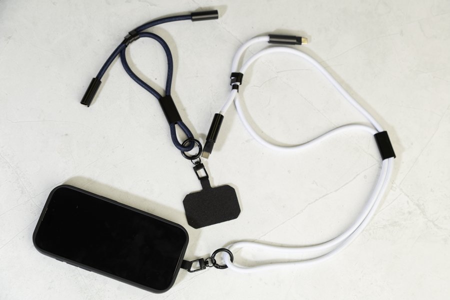 Šňůrka s držákem na mobil z RPET s vložkou pro telefon, karabinou a integrovaným nabíjecím kabelem USB-C na USB-C se skrytými konektory. Podporuje rychlé nabíjení a přenos dat PD 60W.