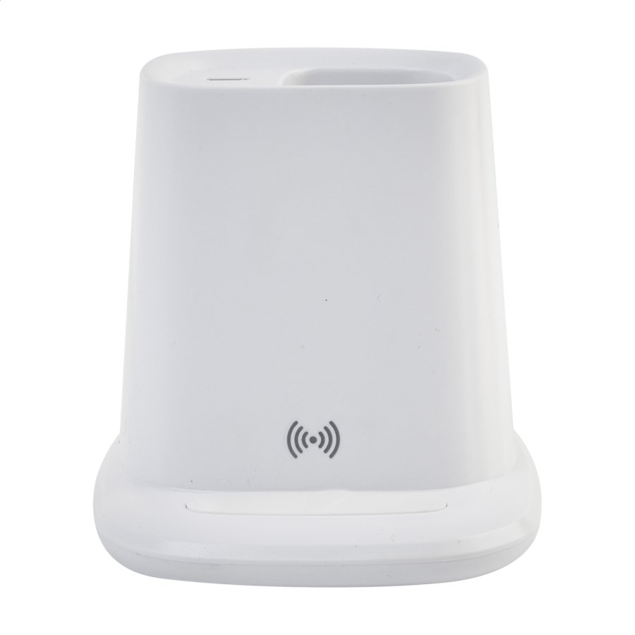 Multifunkční stojánek na pero z recyklovaného ABS plastu s držákem na mobil, vestavěnou bezdrátovou rychlonabíječkou (10 W), 1 USB a 1 USB-C portem pro nabíjení. Včetně USB kabelu pro nabíjení.